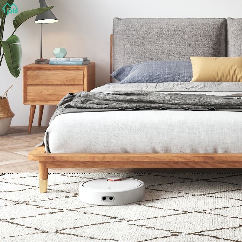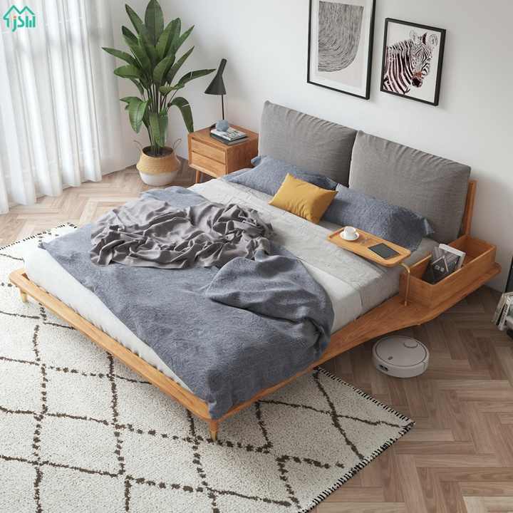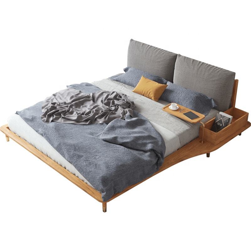 Letto Matrimoniale in Legno con Testiera in Cotone e Lino, Design Moderno con Comodino