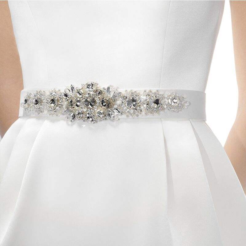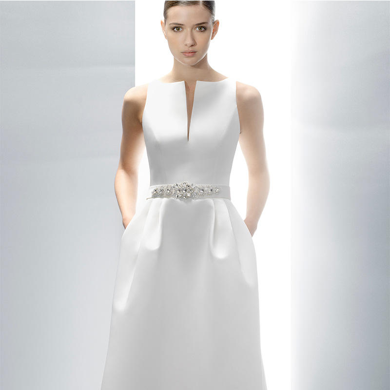Abito da Sposa da Sera Semplice di Lusso in Raso Bianco con Profonda Scollatura a V, Senza Maniche, a Vita Alta e Linea ad A Snellente
