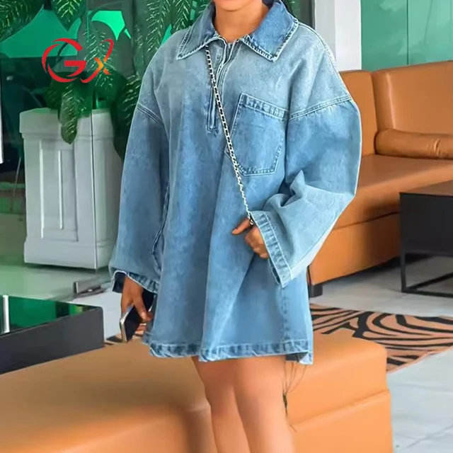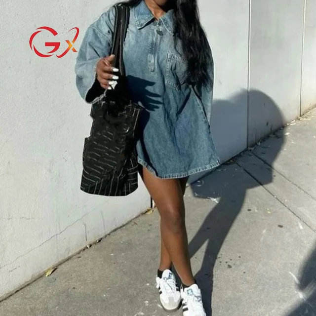 Abito in denim semplice e alla moda, 100% cotone traspirante, con maniche lunghe e decorazioni a bottoni