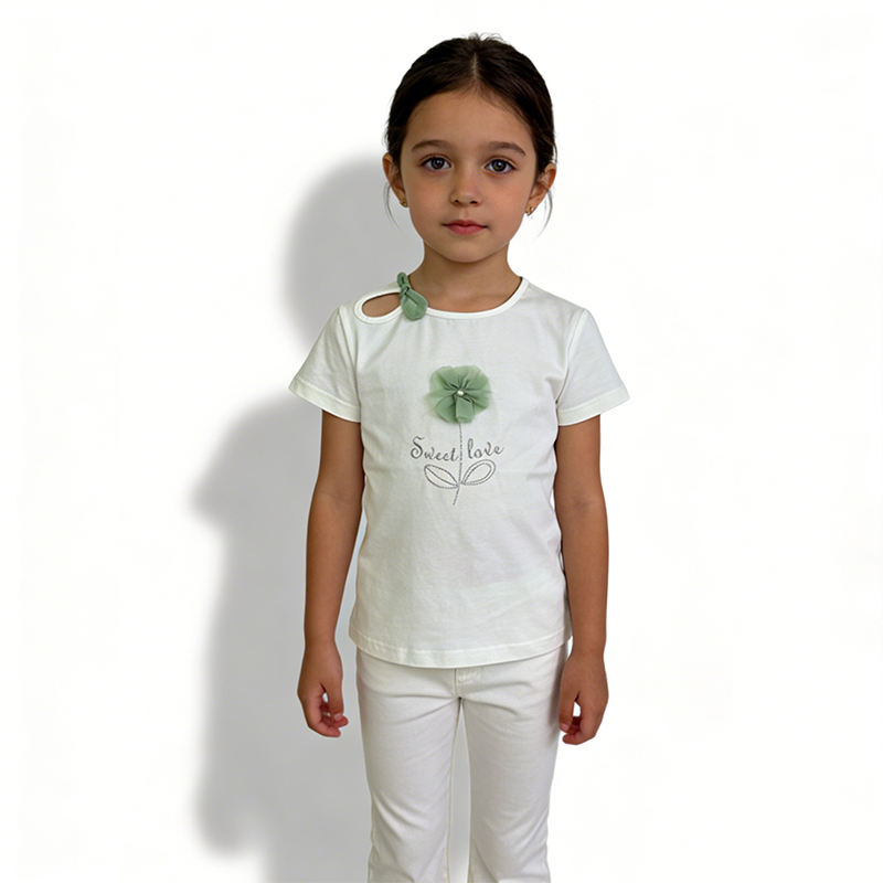 T-shirt da ragazza semplice con base bianca e decorazioni verdi chiaro, stampa floreale 3D, lettere e fiocco, morbida, delicata sulla pelle e traspirante