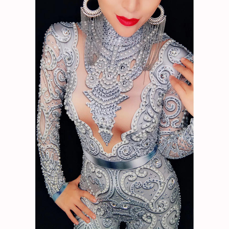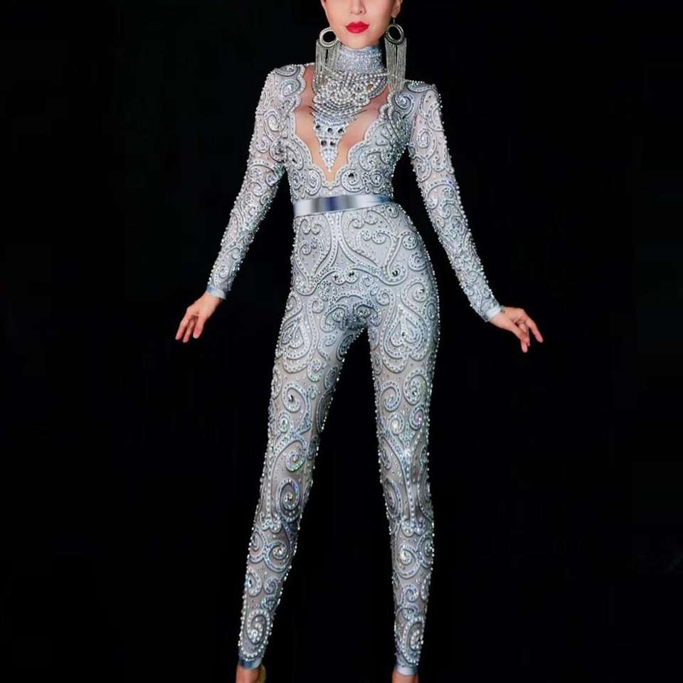 Body da Cantante Sexy con Strass Floreale, Aderente a Maniche Lunghe, Abbigliamento da Club, Tuta Slim da Donna per Danza, Serate e Spettacoli
