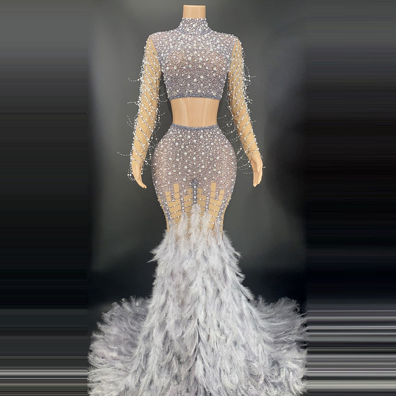 Singer Women Show birthday Two Sets Long Luxury Diamond Crystal Feather Evening Slit Prom Evening Party Cocktail Dress