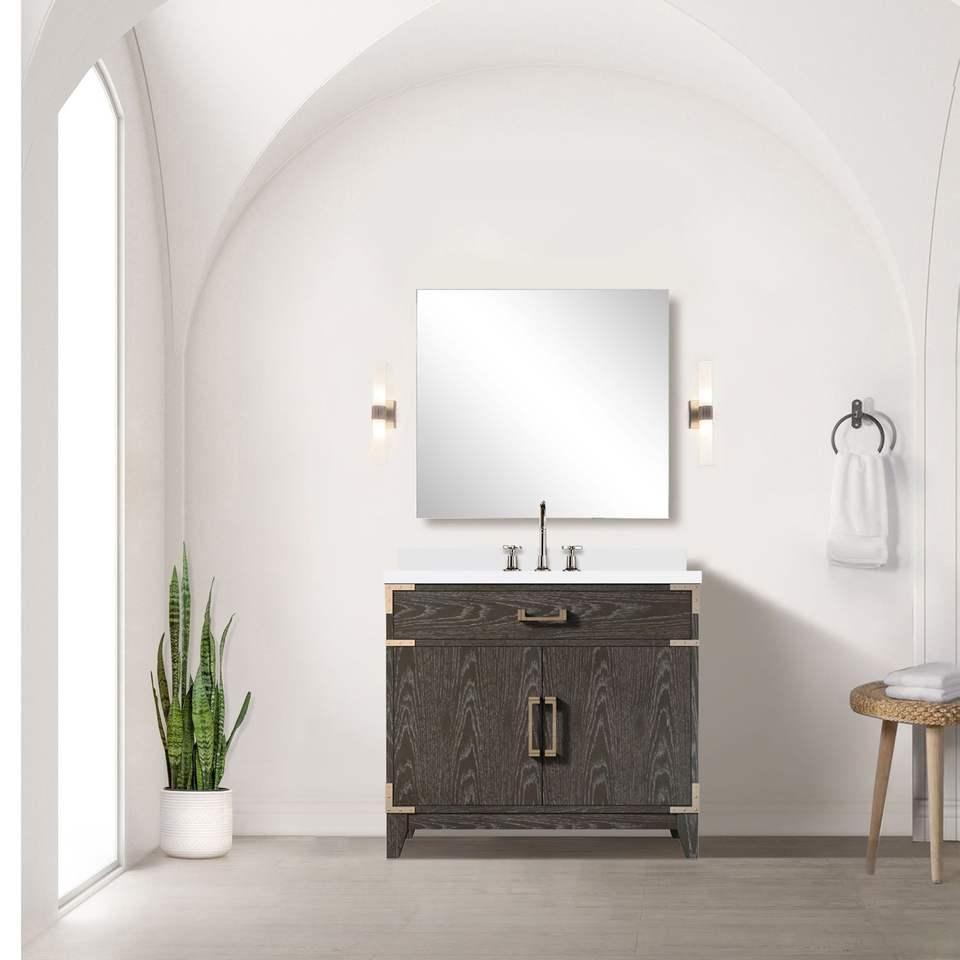 Vanità da bagno singolo 36 pollici. W X 22 In. D 34 In. Specchio rovere marrone con marmo coltivato piano bagno vanità