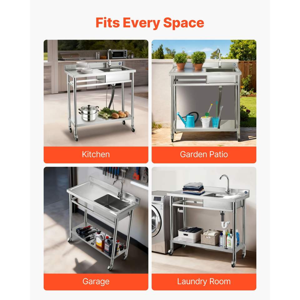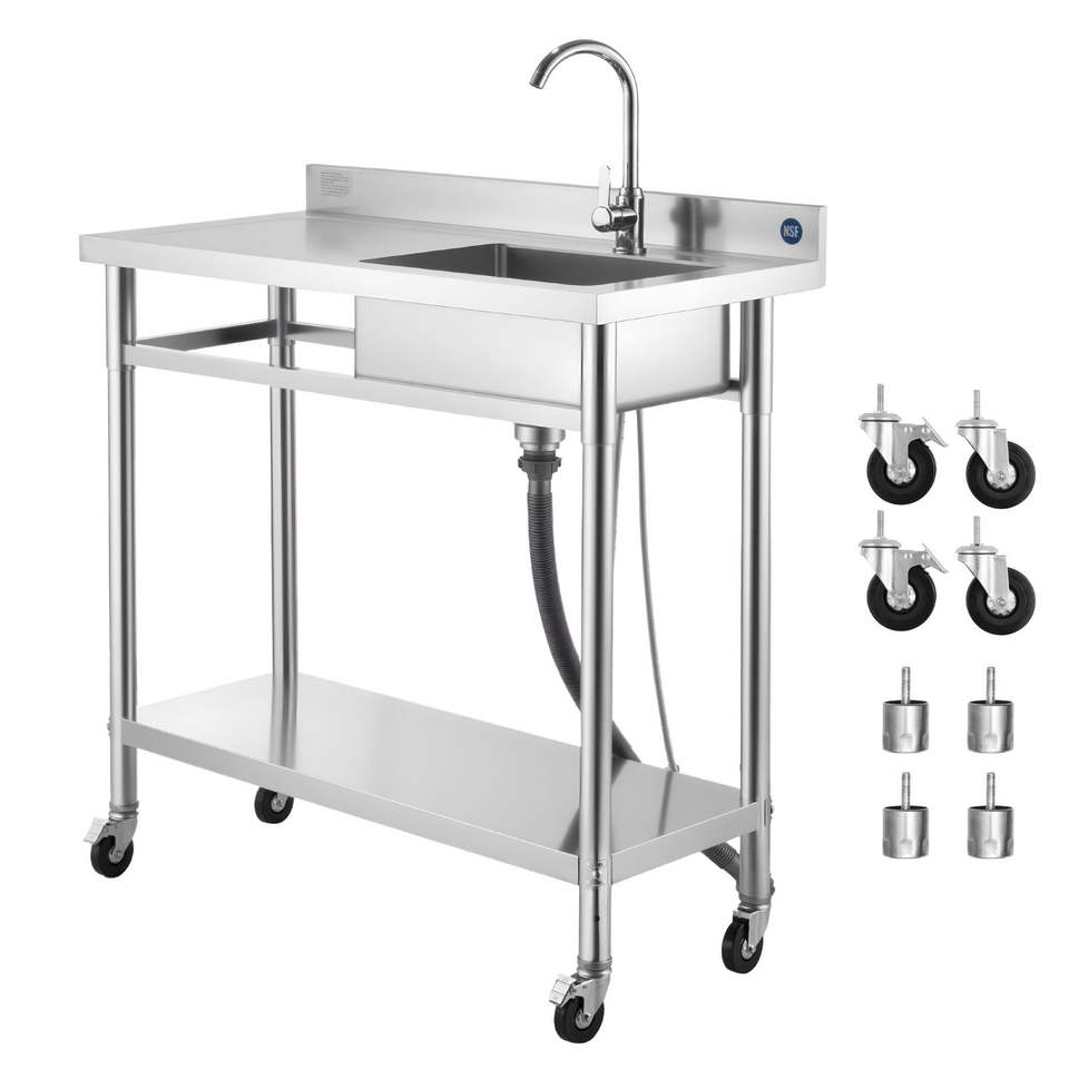 Lavello Commerciale a Vasca Singola in Acciaio Inossidabile con Ruote e Rubinetto Acqua Calda/Fredda per Cucina Professionale