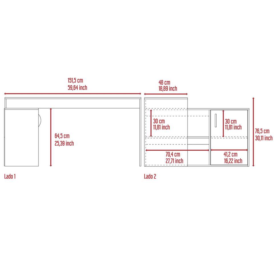 Armadietto a porta singola con scrivania a forma di L, due ripiani aperti, due ripiani interni, scrivania per computer bianca