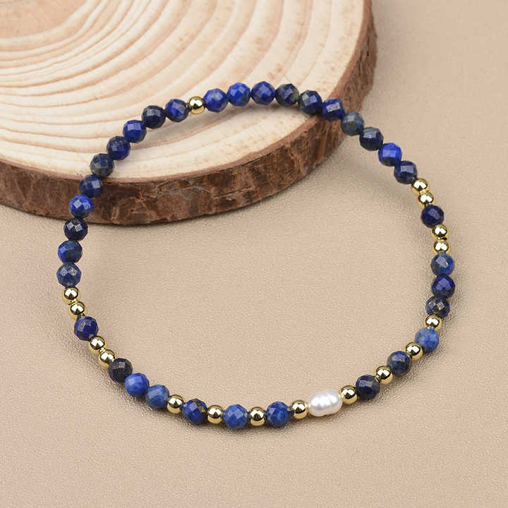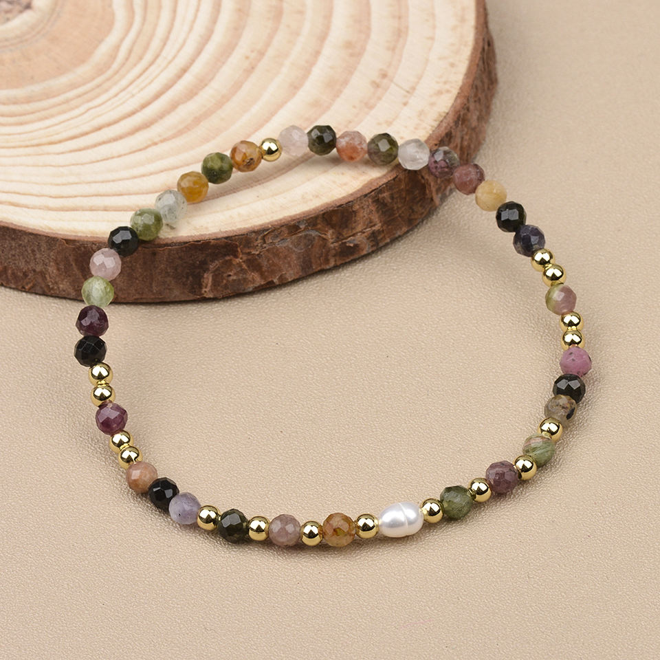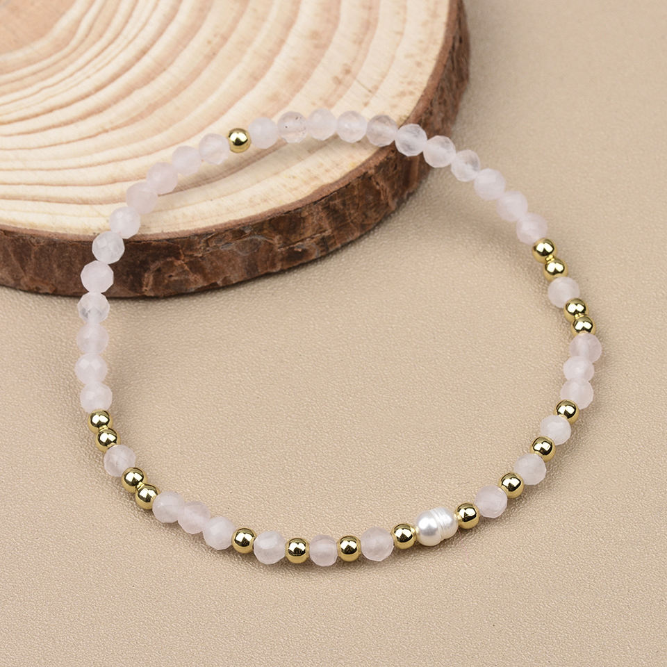 Bracciale Elastico con Perla Singola d'Acqua Dolce a Chicco di Riso e Perline di Pietre Naturali Sfaccettate Tonde da 4mm in Tormalina, Lapislazzuli, Ametista e Quarzo Rosa
