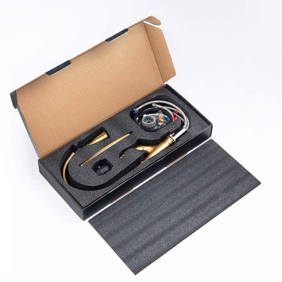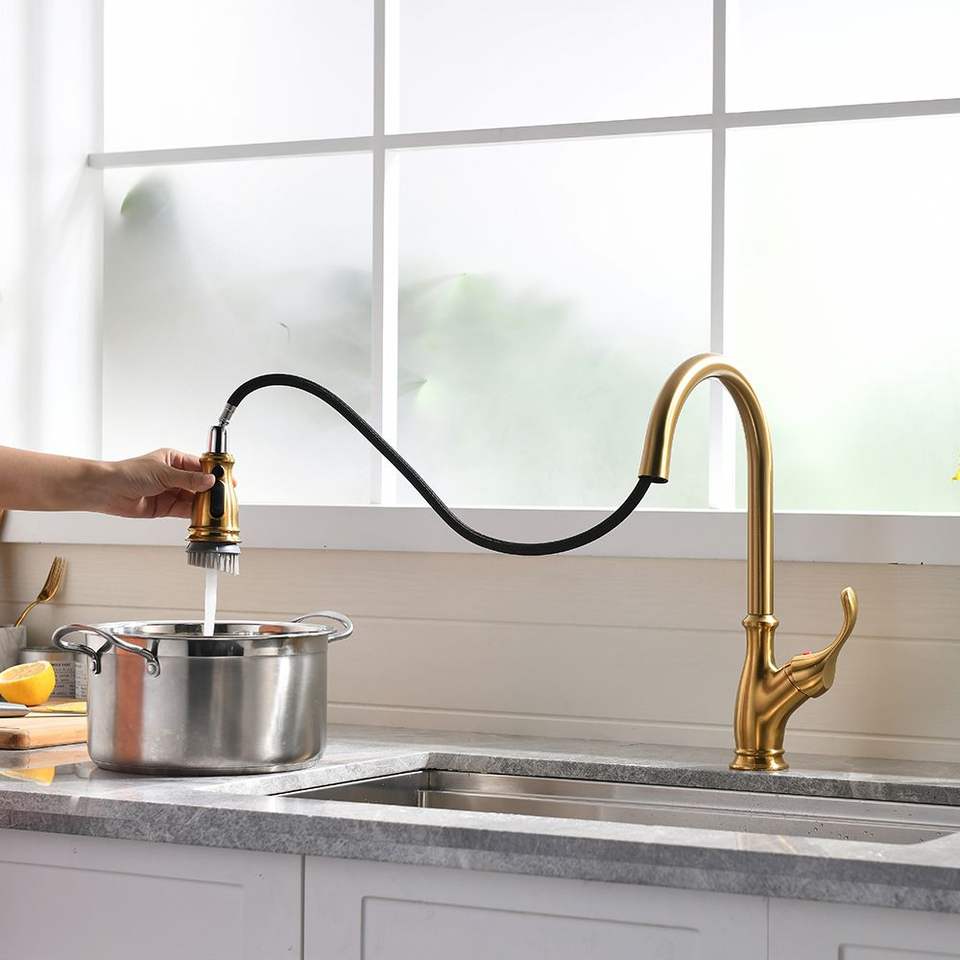 Rubinetto da cucina monocomando a braccio lungo estraibile, color oro, con doccetta estraibile, finitura oro spazzolato, 1 foro
