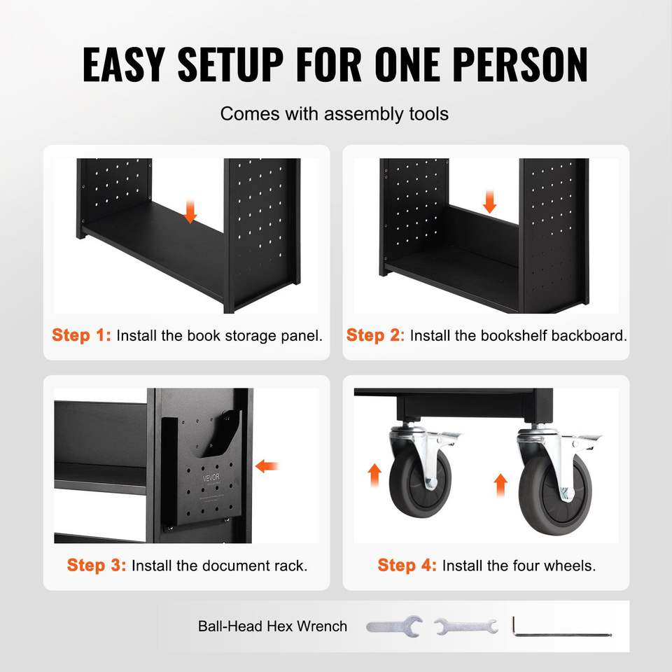 Carrello Porta Libri a L Monofacciale con Ripiani Piatti, Capacità 150 kg, 79,5 cm x 38,6 cm x 124,9 cm, con Ruote Bloccabili, 10 cm di Spessore
