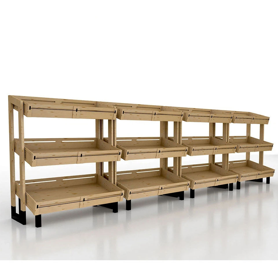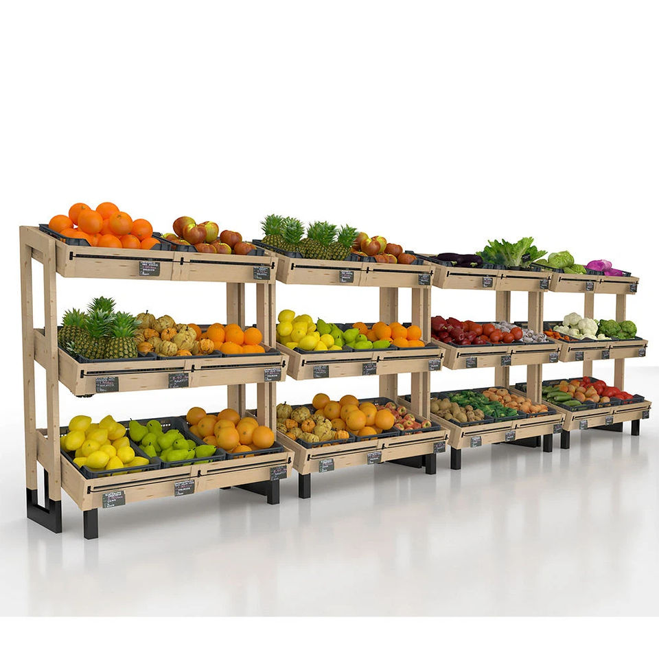 Espositore per Verdura Fresca da Supermercato Personalizzato in Legno a Singola Facciata con Ruote