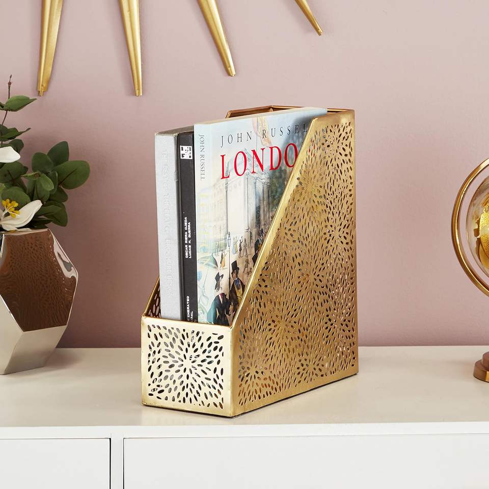 Porta File rivista singola Slot con disegno in metallo oro intagliato a Laser motivo floreale per la decorazione della casa