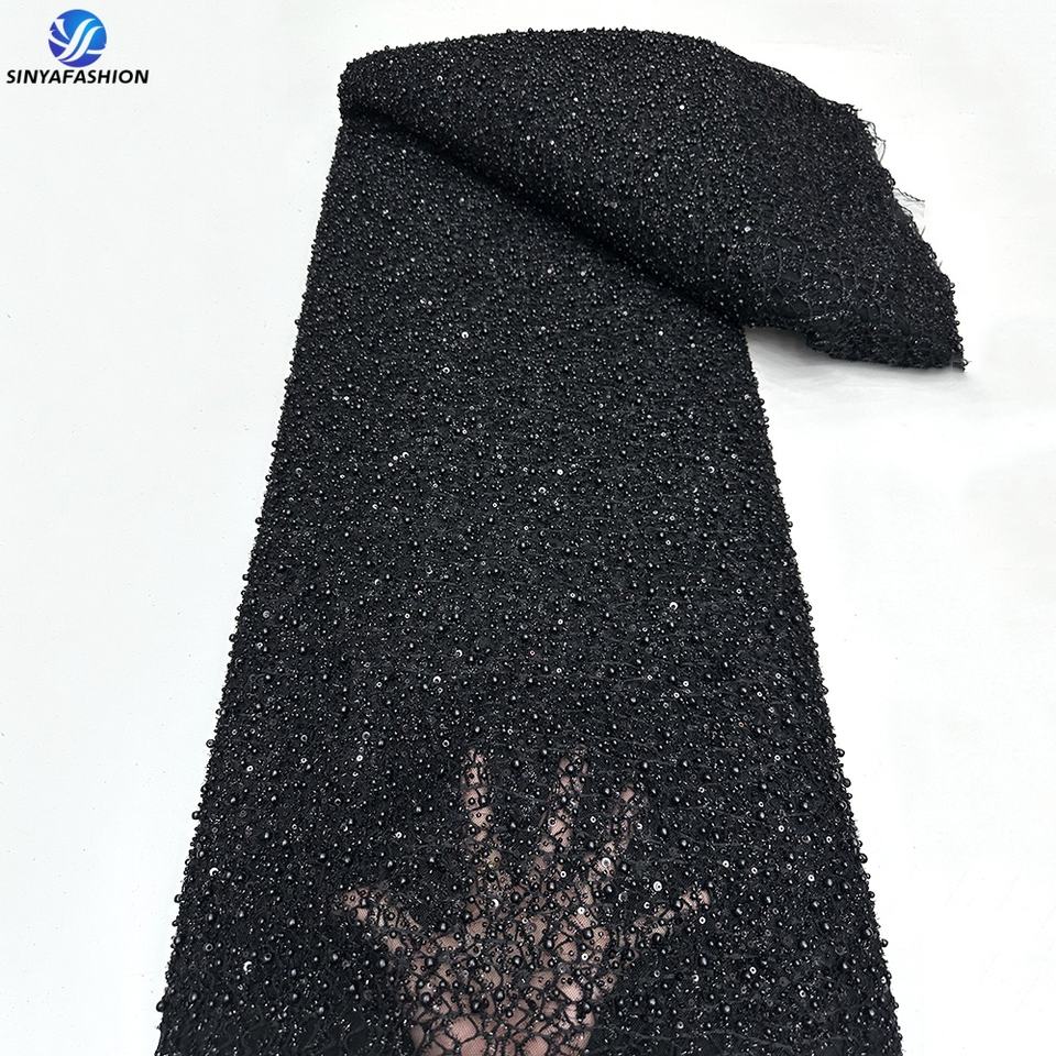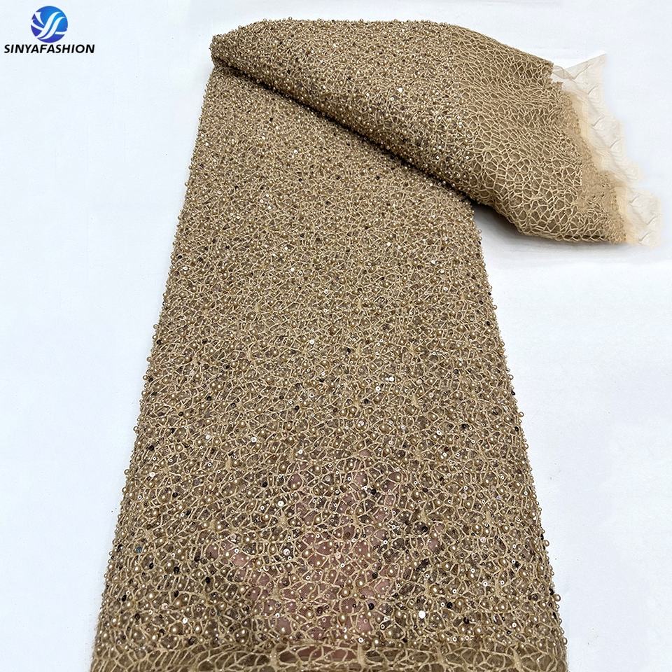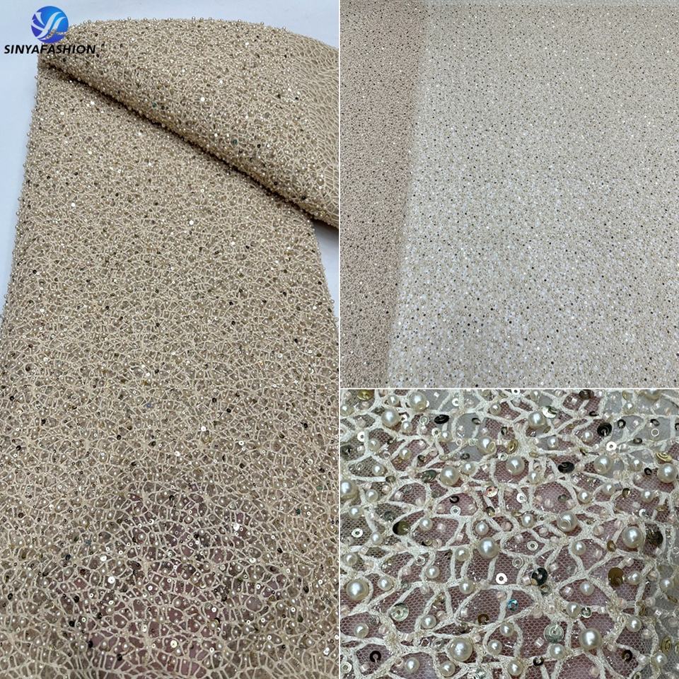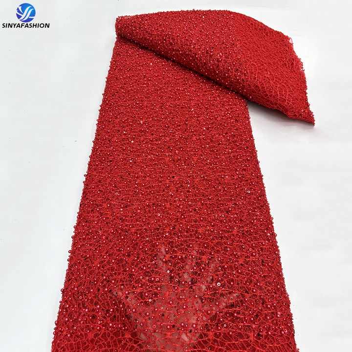 Sinya Luxury Heavy Beaded Lace Fabric Red for African Weddings Dresses Bridal French Mesh Sequins Pearls Tulle Lace 5 Yards