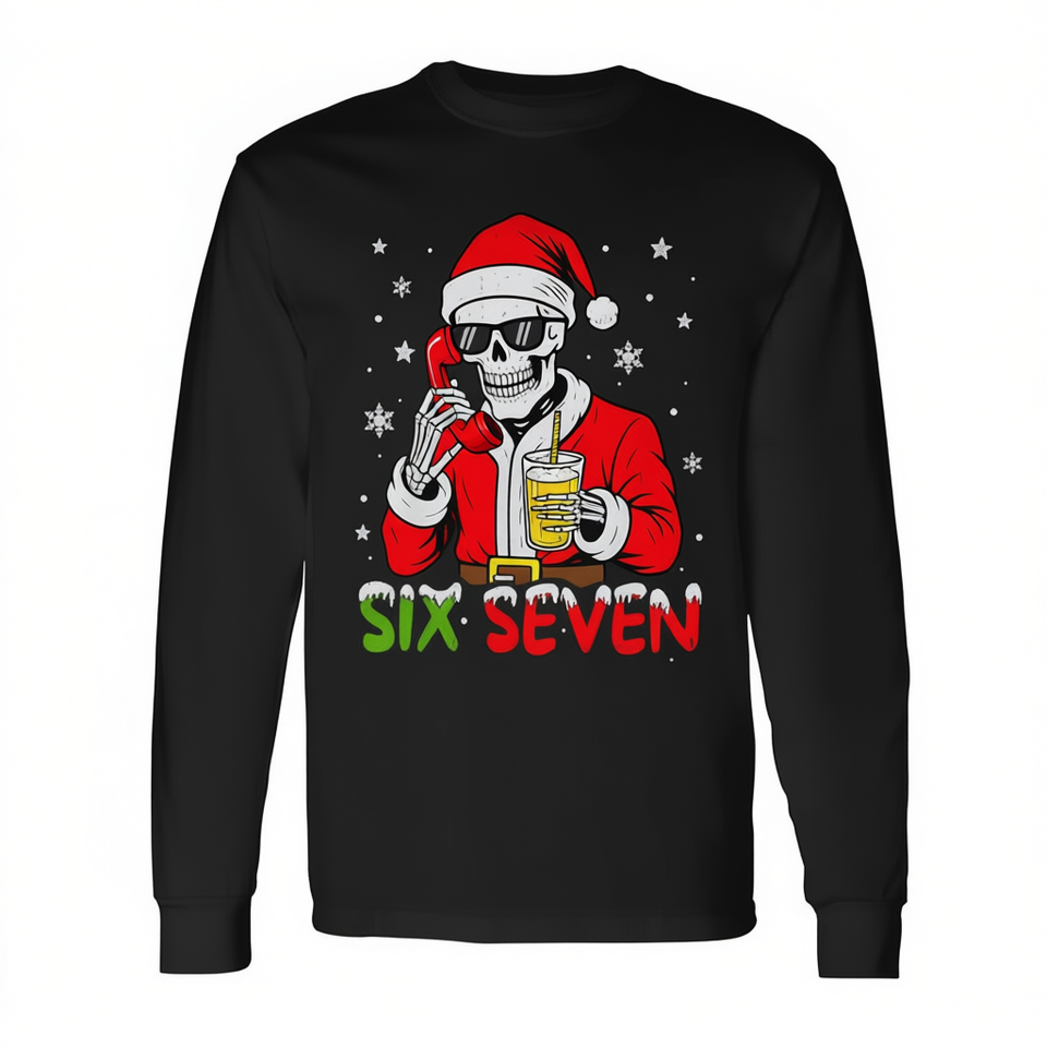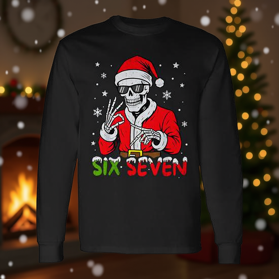 Six Seven Skeleton Santa Christmas T-shirt a maniche lunghe con design natalizio Gen Z Slang