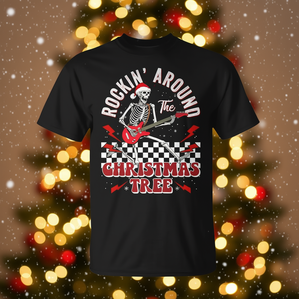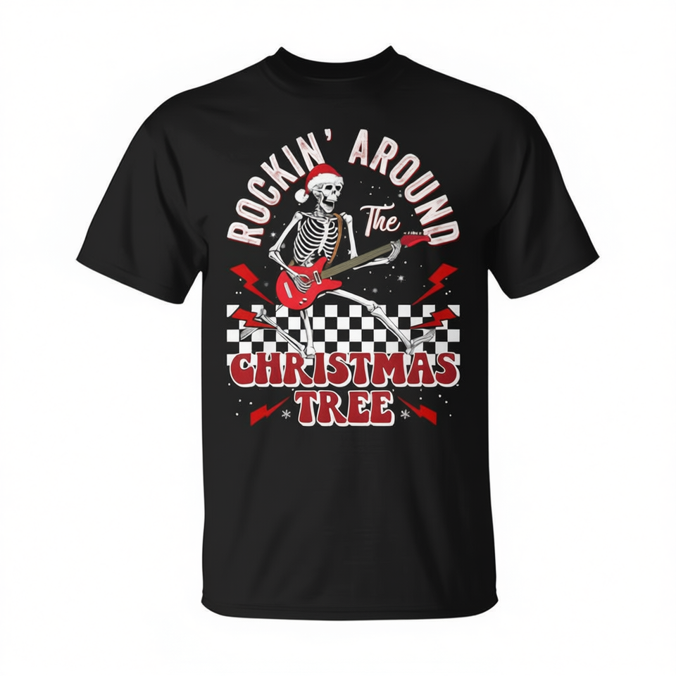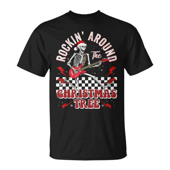 Maglietta natalizia Skeleton Guitar, unisex, a maniche corte, girocollo, per feste a tema rock