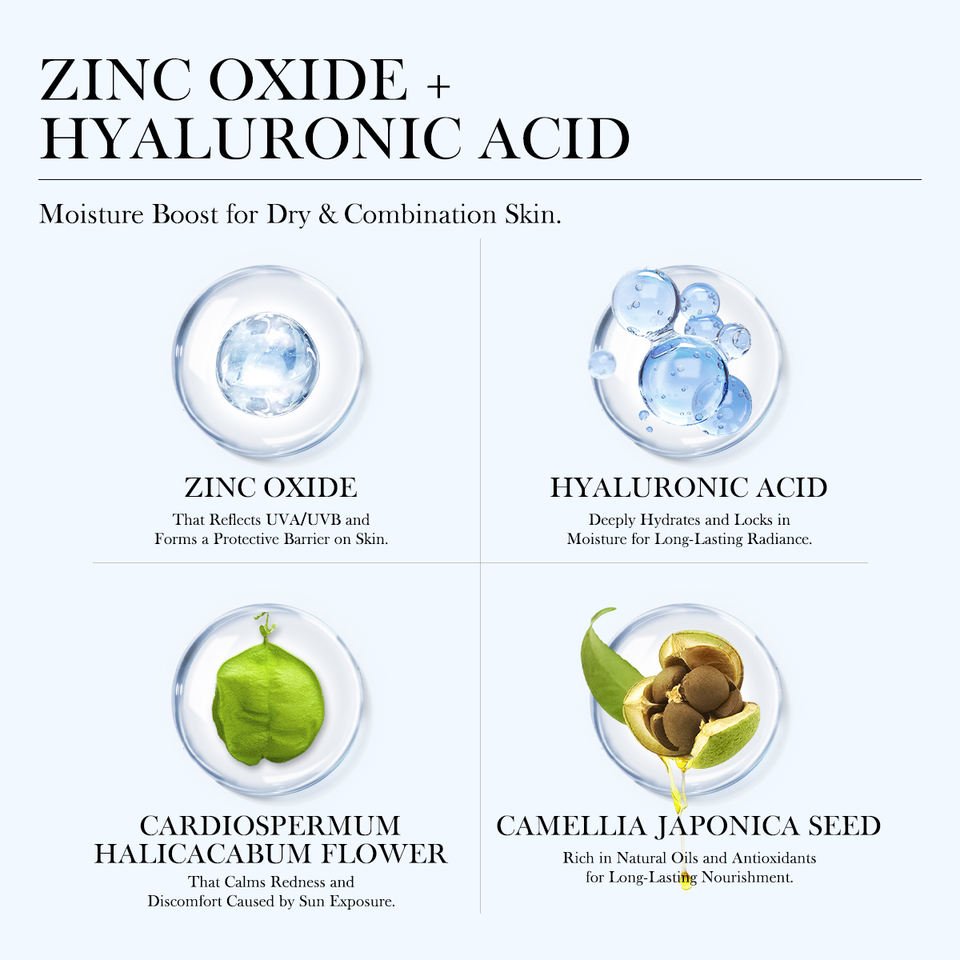 Ossido di Zinco, Acido ialuronico, FIORE DI CARDIOSPERMUM HALICACABUM, Seme di Camellia JaponicaIngrediente principale
