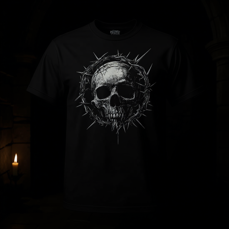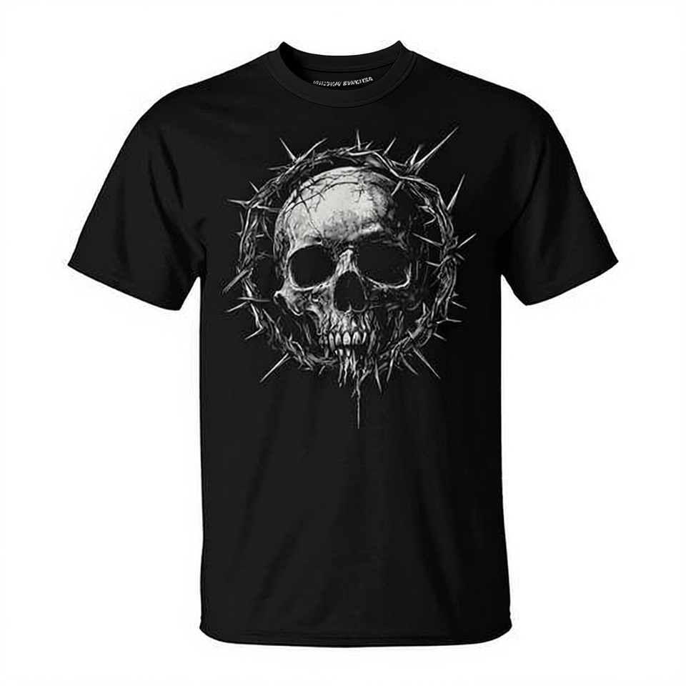 T-shirt gotica con teschio e corona di spine, nera, da uomo, taglia media