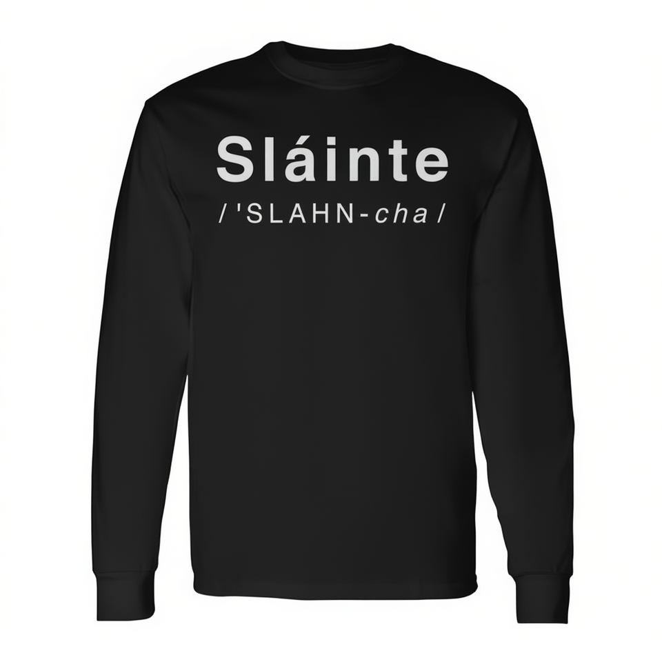 Maglietta Promozionale Unisex a Maniche Lunghe con Stampa Digitale 'Slainte Irish Cheers to Good Health' per la Festa di San Patrizio