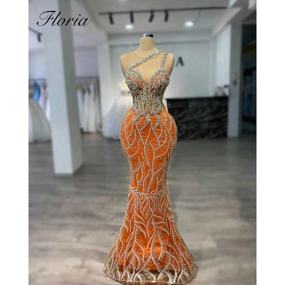 Abito da Cocktail a sirena arancione senza maniche con scollo rotondo impreziosito in cristallo stile impero lungo fino al pavimento per feste di compleanno