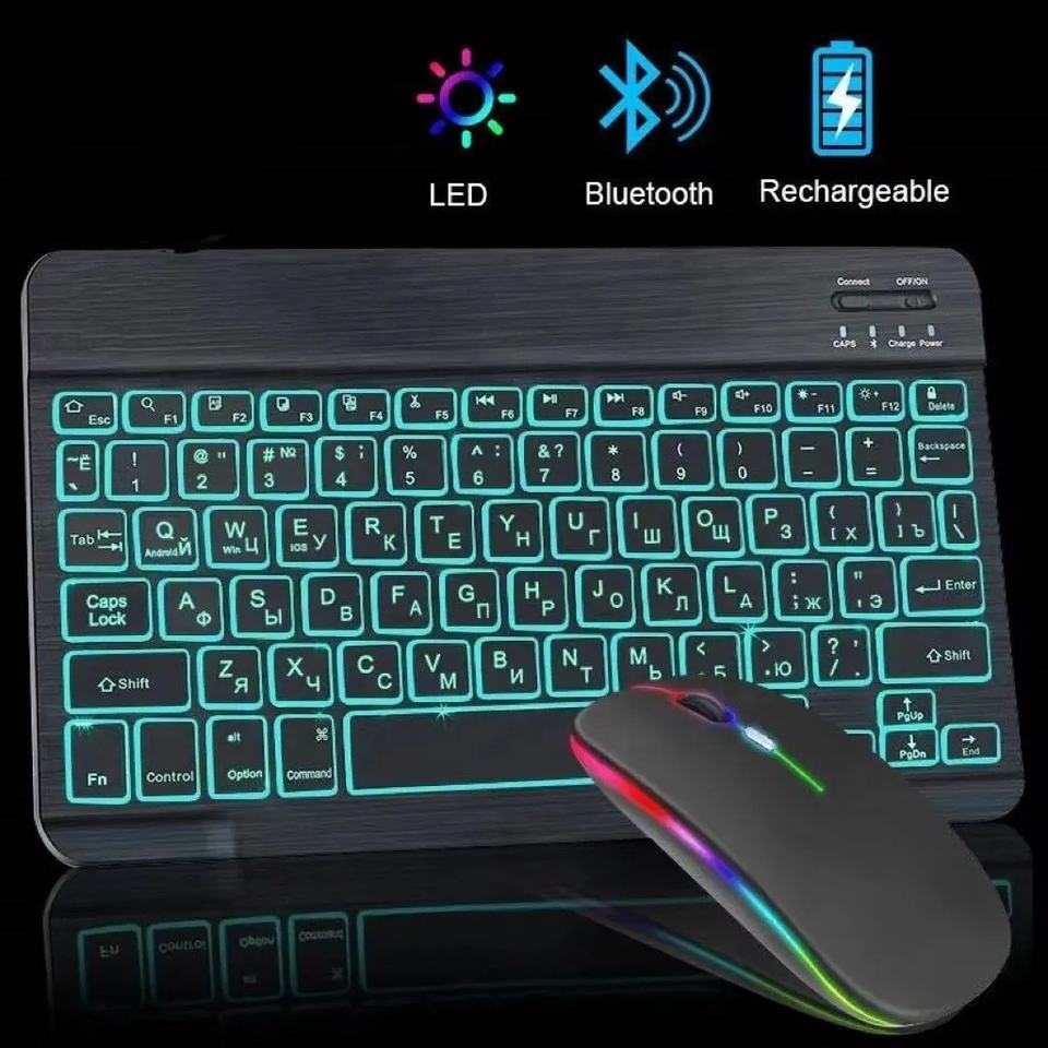 Tastiera e mouse Bluetooth slim retroilluminati ricaricabili 25×15×0,6 cm, 78 tasti, 5 milioni di pressioni, portata 10 m per smartphone/tablet 9,7–11" Android/iOS/Windows