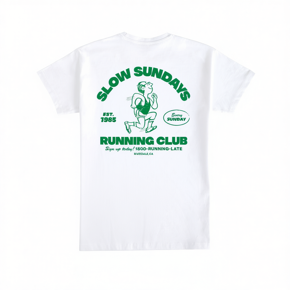 T-shirt bianca Slow Sundays Running Club, taglia unisex per adulti, taglia grande, ogni domenico, Riverdale CA
