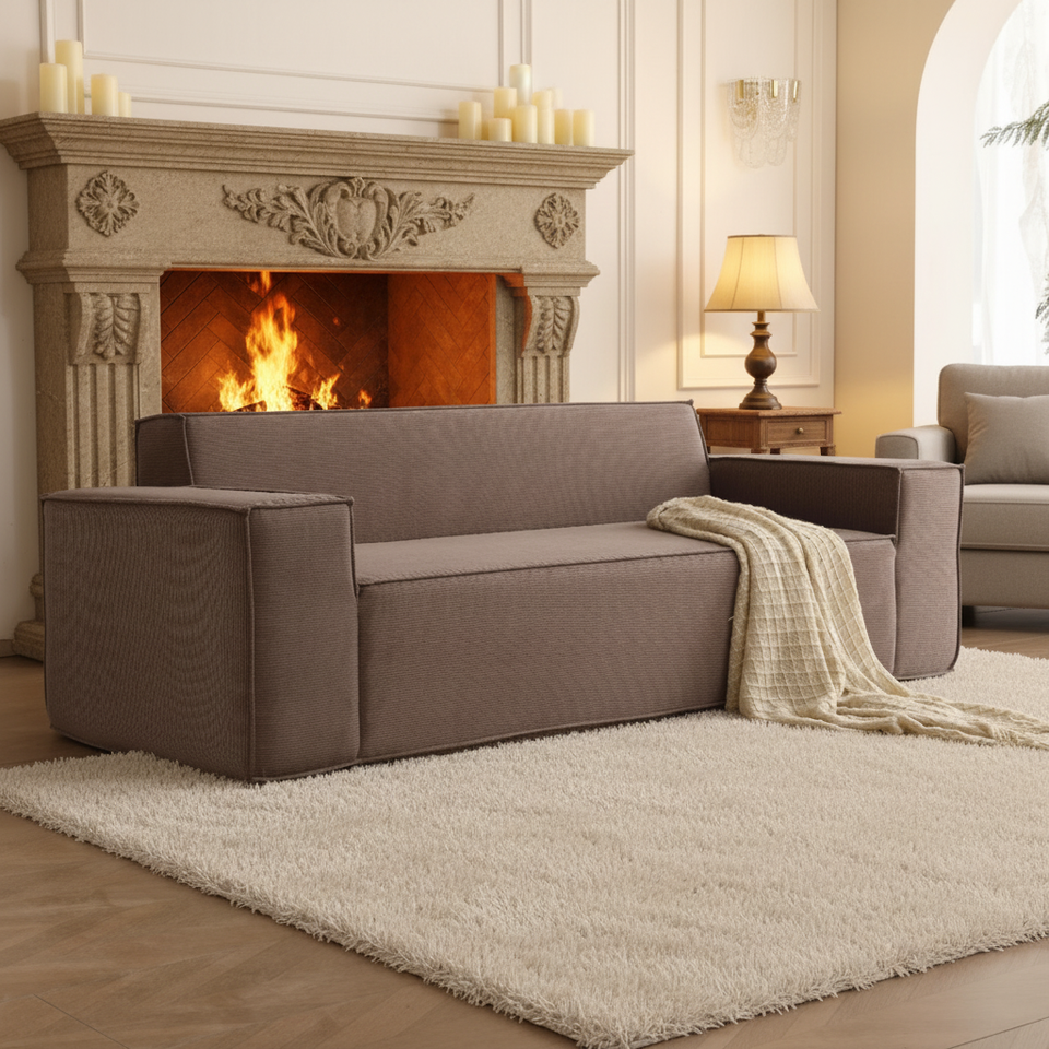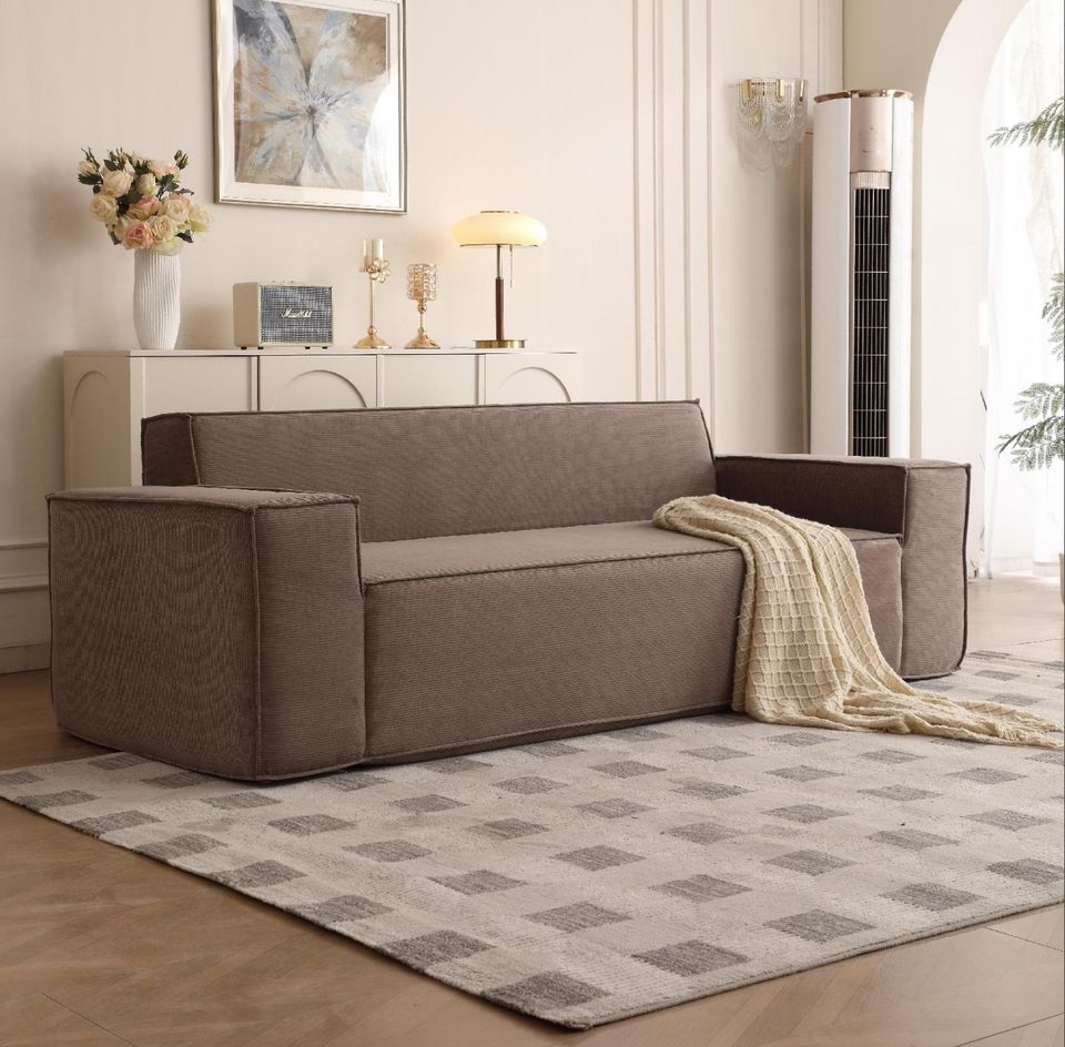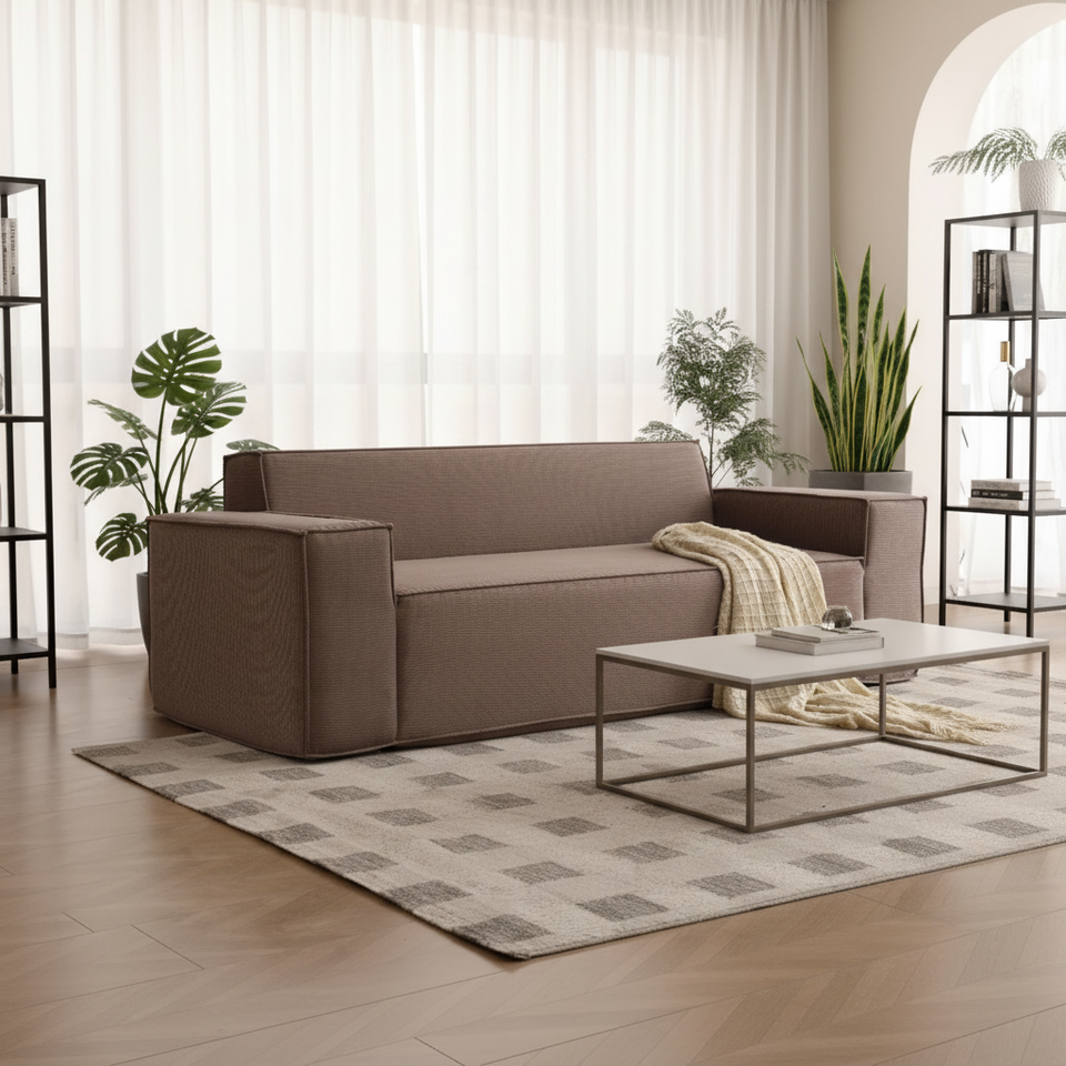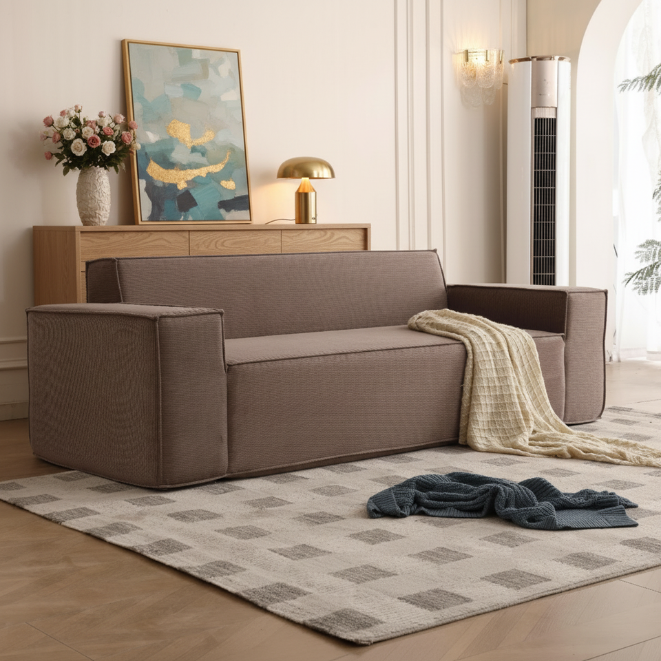 Divano Monoposto per Piccoli Soggiorni, per Tre Persone, in Velluto Ecologico, Design Giapponese, Set Modulare a Blocchi Tofu