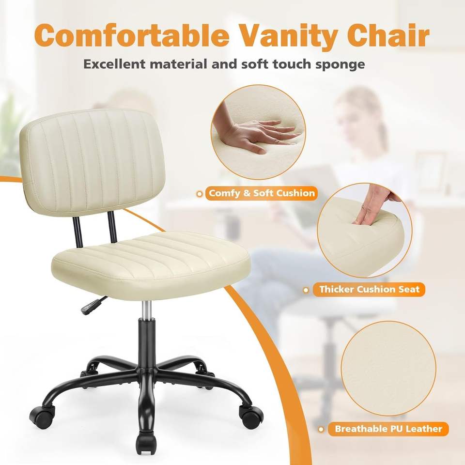 Sedia da Ufficio Piccola Senza Braccioli in Pelle PU Beige Bianca con Comodo Supporto Lombare