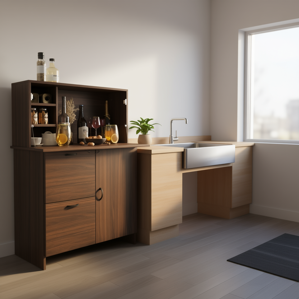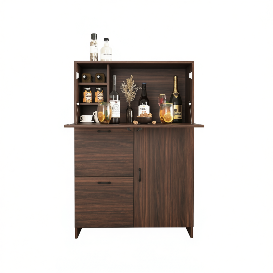 Walnut Particle Board Bar Cabinet With Storage Drawer And Shelves Fold Up Desktop For Small Spaces Home Dormitory