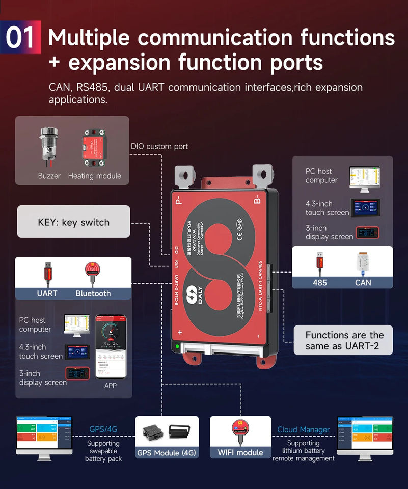 Nome del prodotto:Smart 12V/24V/48V lifepo4 Bms 4s 8s 16s 20s 32s Daly BMS