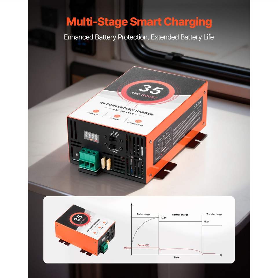 Convertitore di Potenza Smart da 35 Amp per Camper con Caricabatterie 110V AC 12V DC, 4 Fasi, Range Operativo 13V 16.5V per Sistemi Elettrici RV