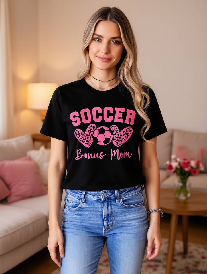 Soccer Bonus Mom Women's Round Neck Short Sleeve T-Shirt Pink Print Casual Spring Summer Jersey 100% Cotton