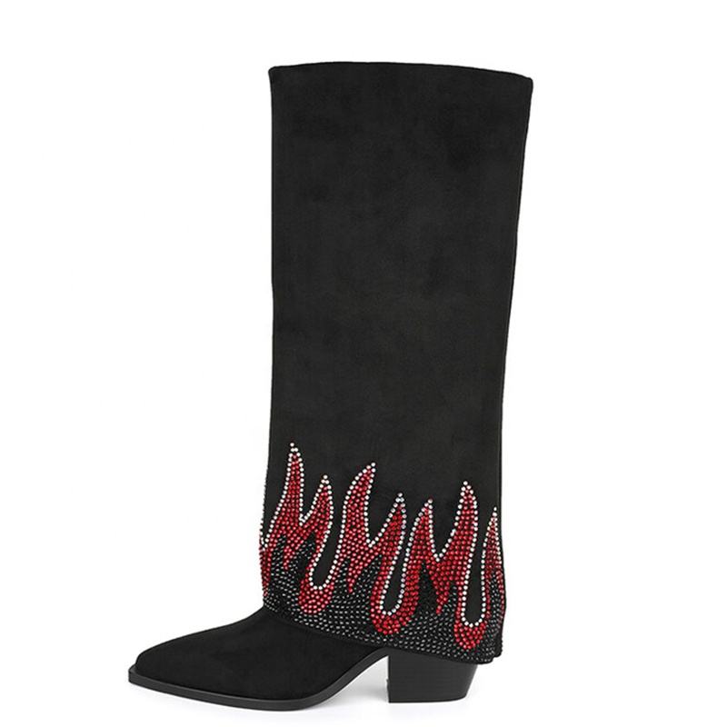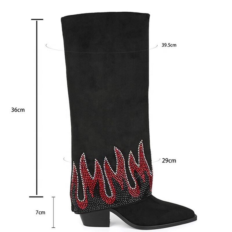 Stivaletti lunghi floccati morbidi Overlay moda donna piccoli diamanti stivali alti al ginocchio fiamma blu tacco alto grosso taglia grande 45