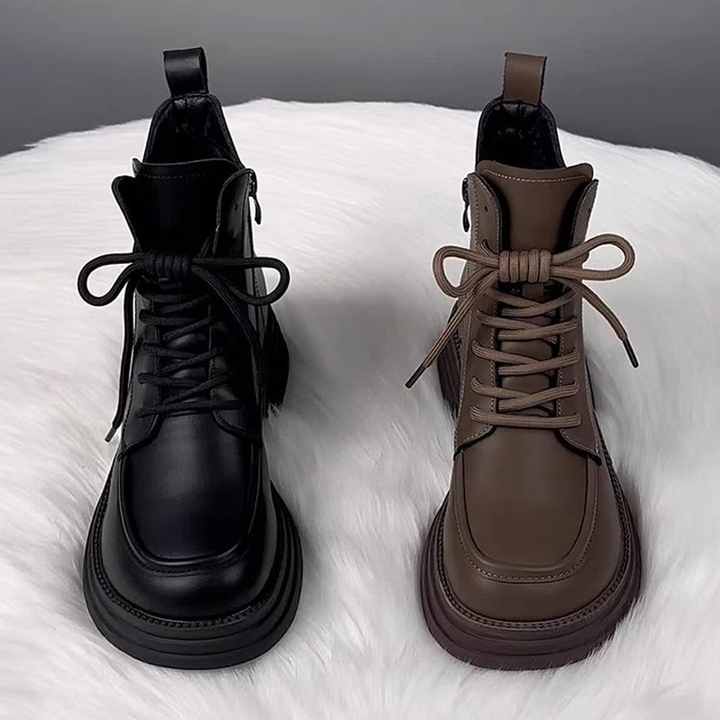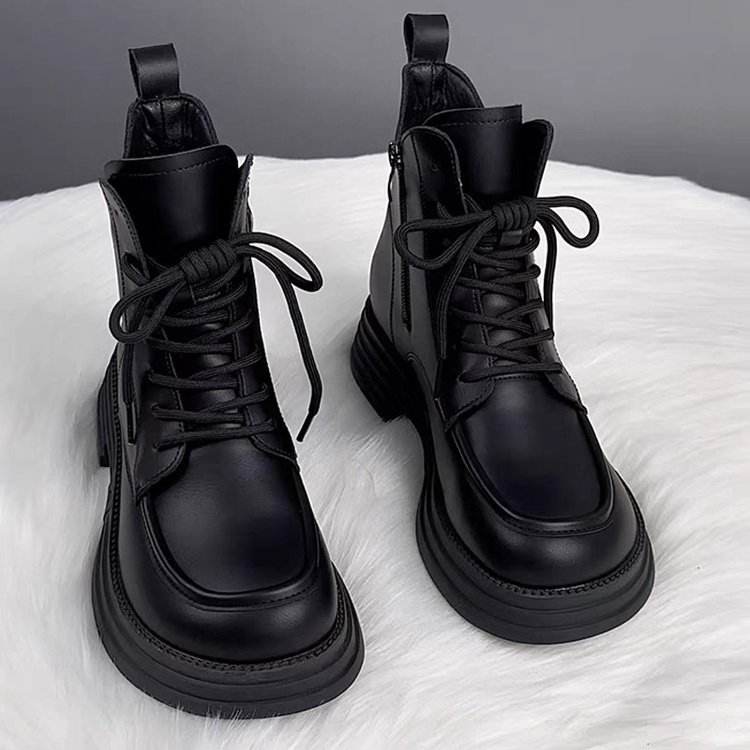 Soft Leather Fleece-Lined Casual Ankle Boots Women 2025 Autumn Winter Thick-Soled Warm 5cm Medium Heel Side Zipper Lace-Up