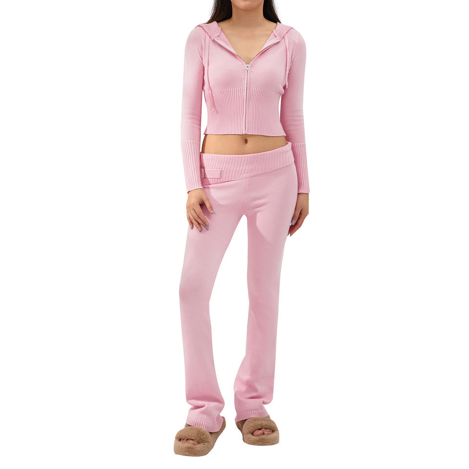 Felpa con cerniera corta in maglia morbida a coste con Leggings a vita bassa/Set di pantaloni da donna 2 pezzi completo completo a maniche lunghe