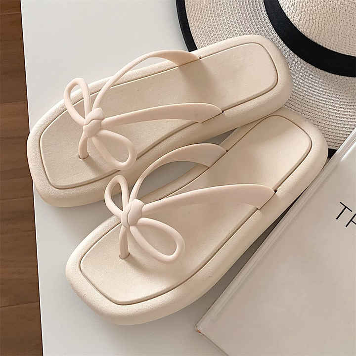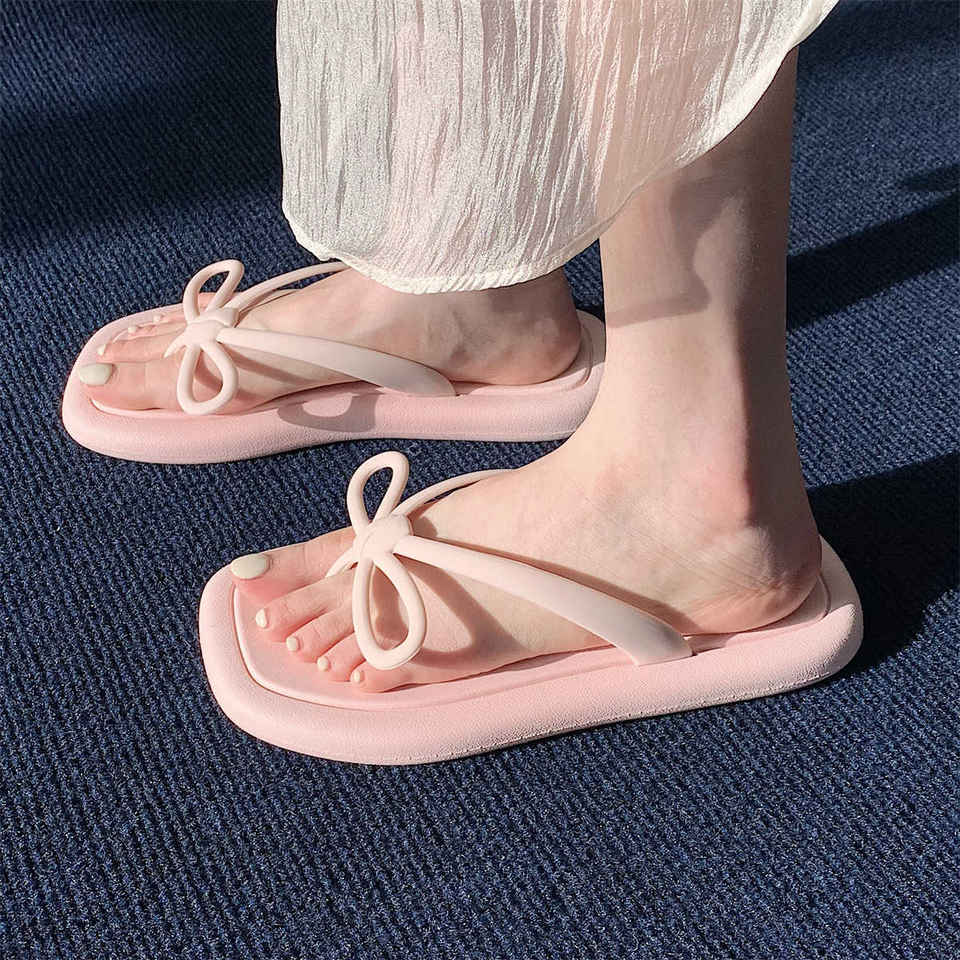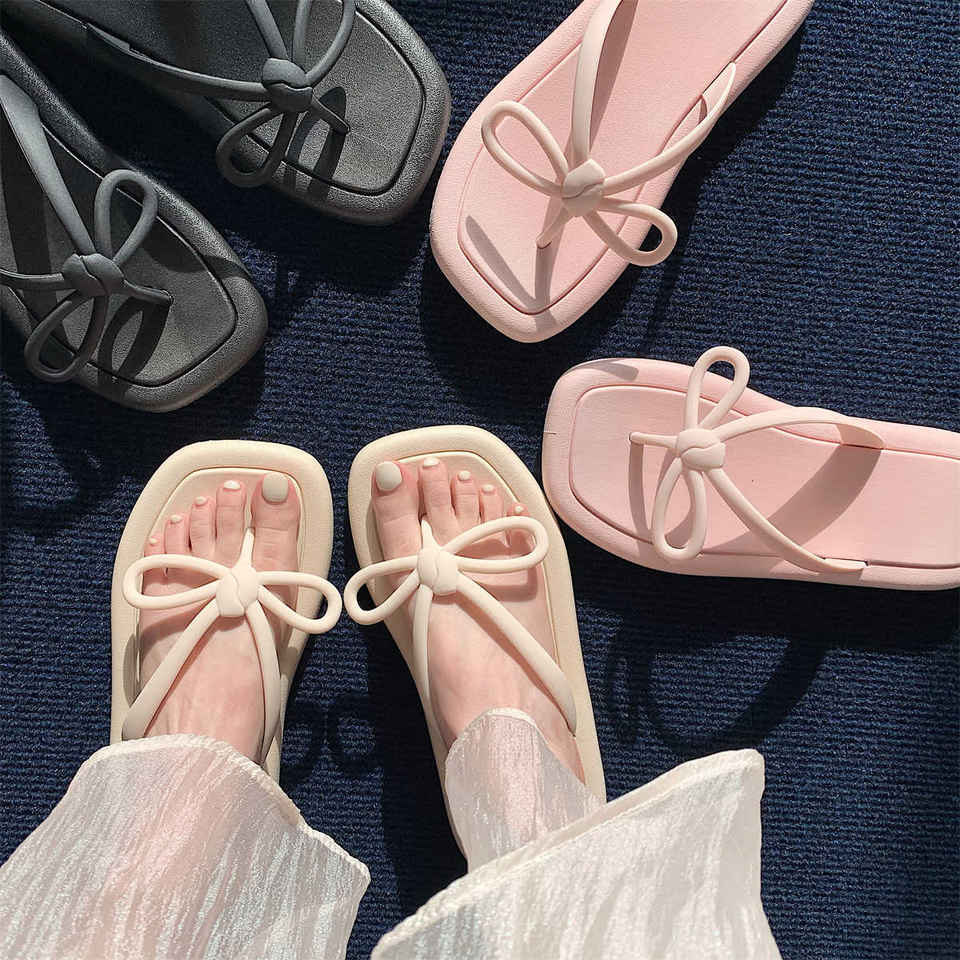 Infradito con fiocco con suola morbida moda estiva da donna semplice versione coreana, la studentessa indossa sandali da spiaggia con i piedi pizzicati a cuore da ragazza