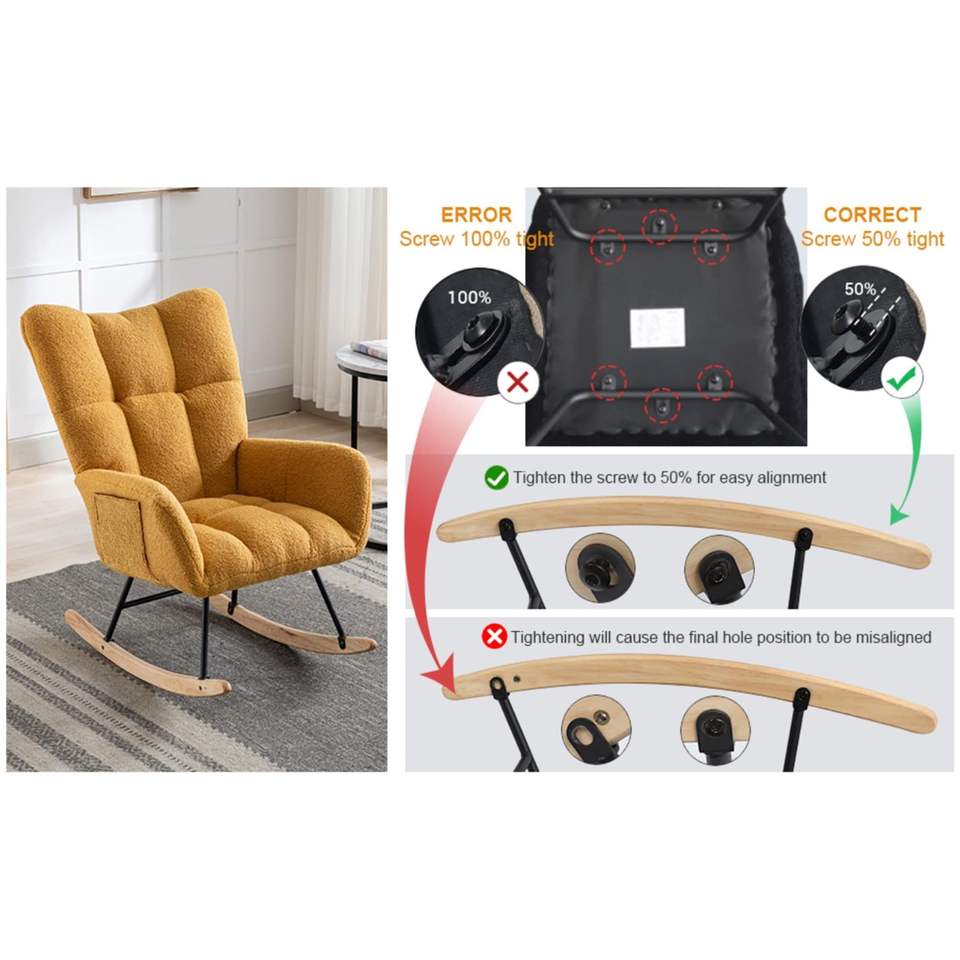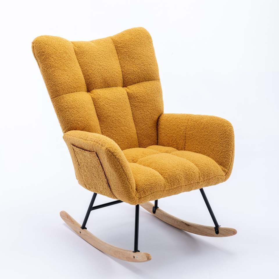 Poltrona a dondolo in morbido tessuto Teddy con tasca, comoda poltrona a sdraio con schienale alto per cameretta, in legno massello, sicura per l'uso in soggiorno