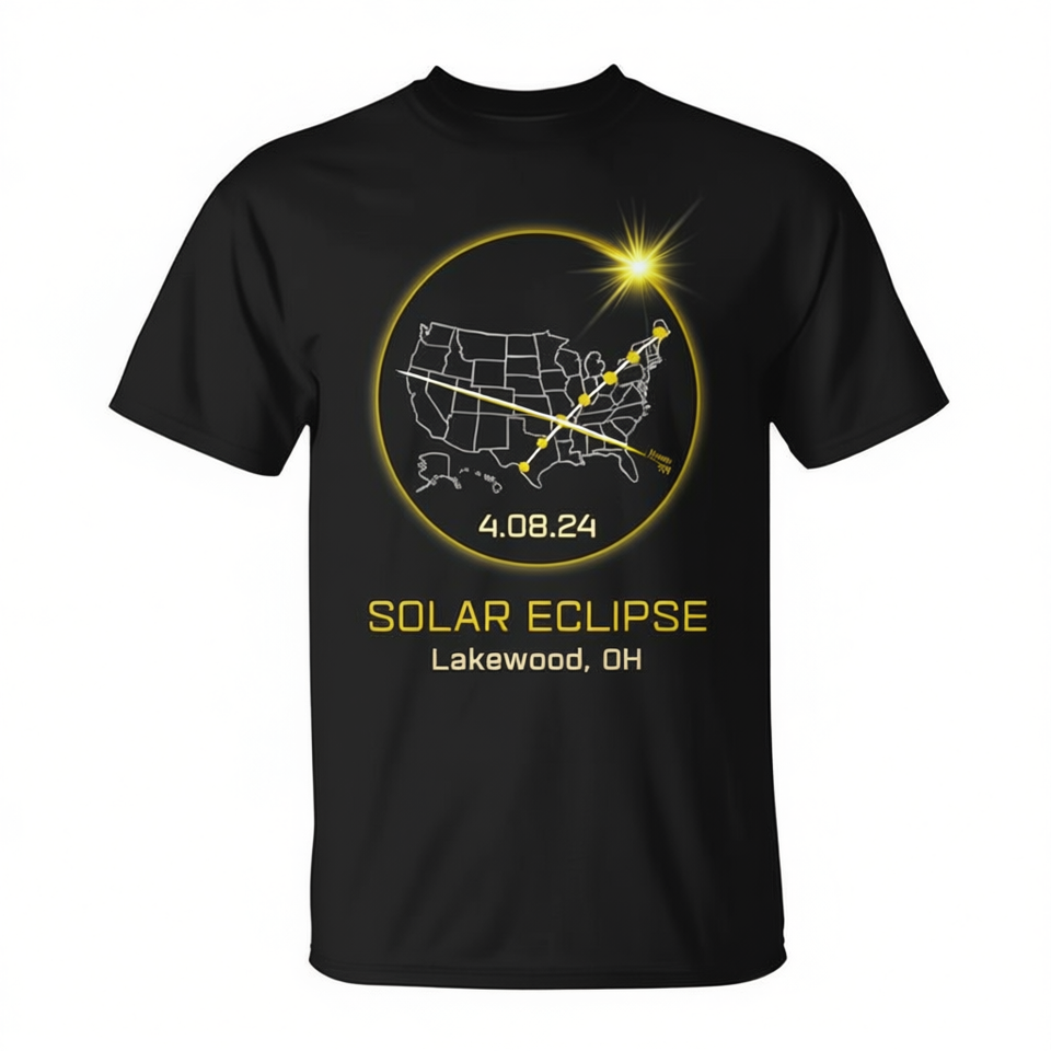 T-shirt Promozionale Unisex per Adulti con Stampa Digitale a Maniche Corte e Girocollo - Eclissi Solare 2024 Lakewood OH Totalità