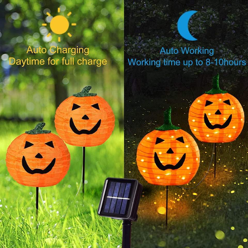 Set di Luci LED a Forma di Zucca di Halloween Alimentate a Energia Solare, 4 Grandi Luci con Picchetto e 2 Modalità per Decorazioni da Giardino e Sentieri