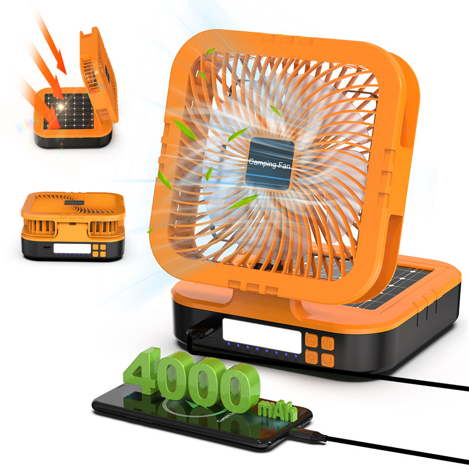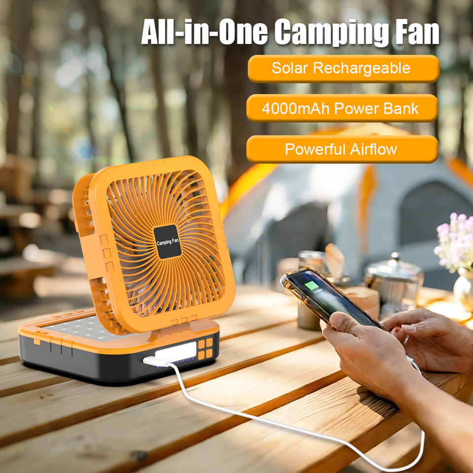 Ventilatore da Campeggio Ricaricabile Solare 4000mAh con Luce LED, Oscillazione e Power Bank USB-C per Auto e Camper, Personalizzabile OEM ODM