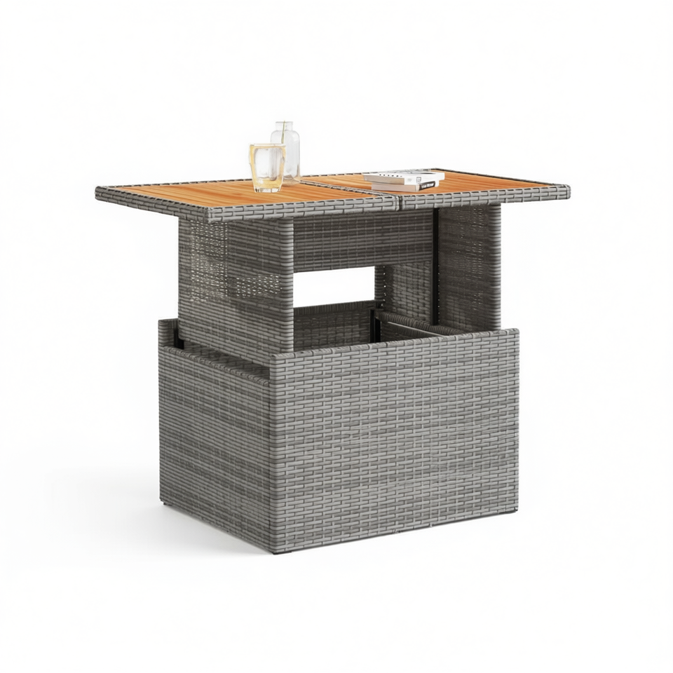 Solid Acacia Wood Outdoor Table Grey Pe Rattan Powder Coated Steel Frame Contemporary Design Durable Garden Furniture