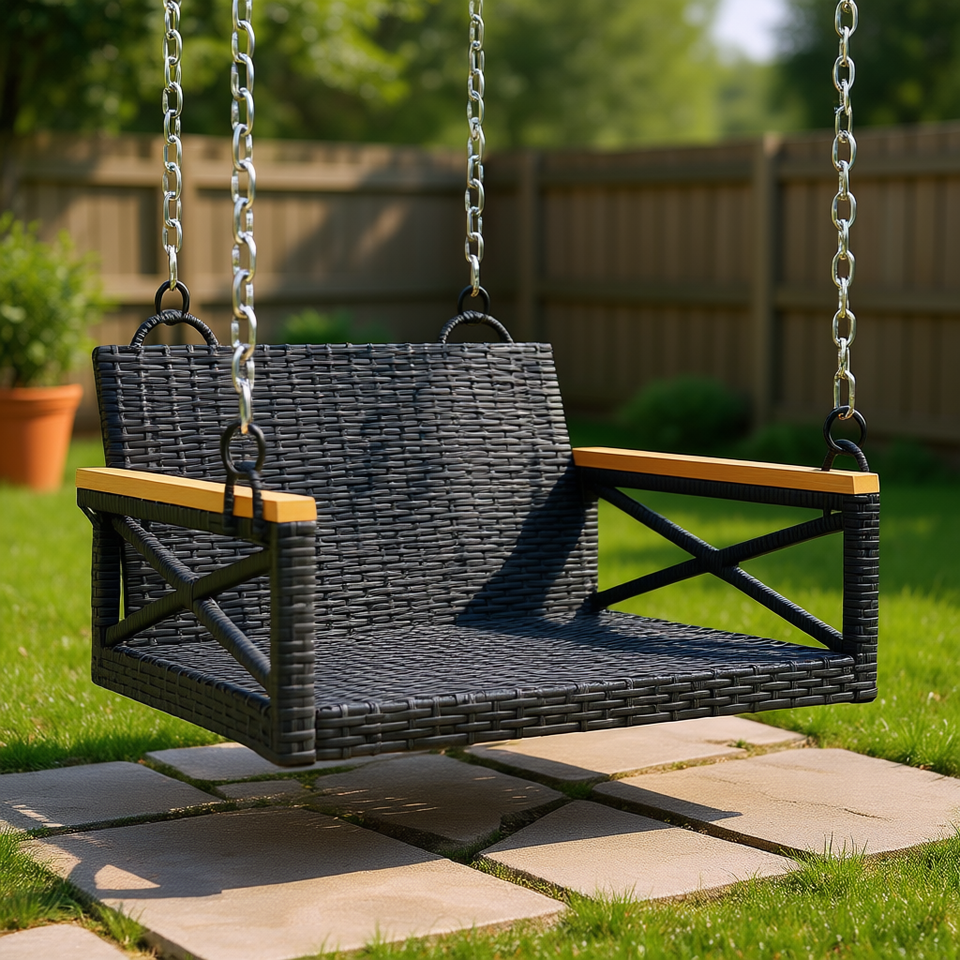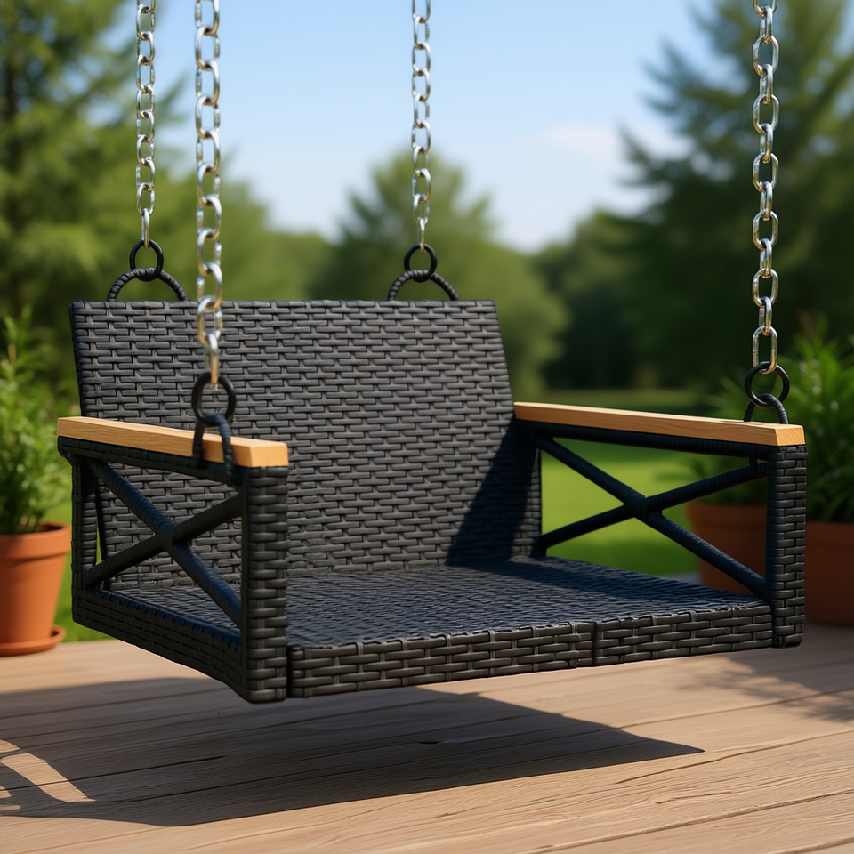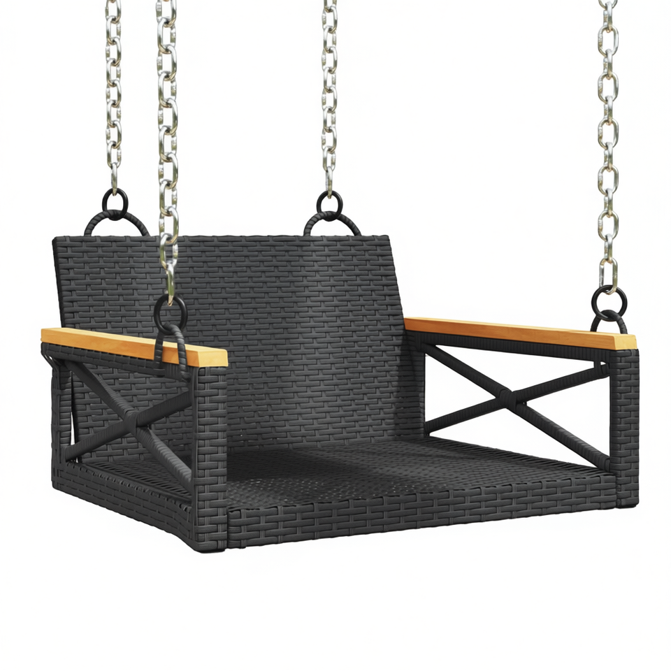 Acacia Wood Swing Bench Black Rattan Powder Coated Steel Frame 2 Seater Patio Outdoor Furniture Contemporary Design