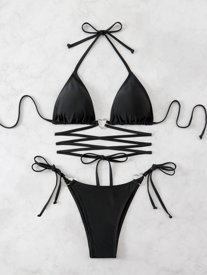 Set bikini solido nero con cut-out per donna, costume da bagno triangolare con cinturino incrociato all'americana