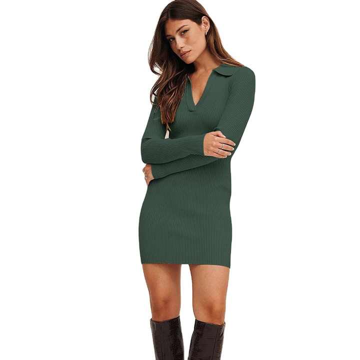 Tinta unita con scollo a V a maniche lunghe a maniche lunghe alla moda Mini abito da donna a maniche lunghe aderente corto da donna