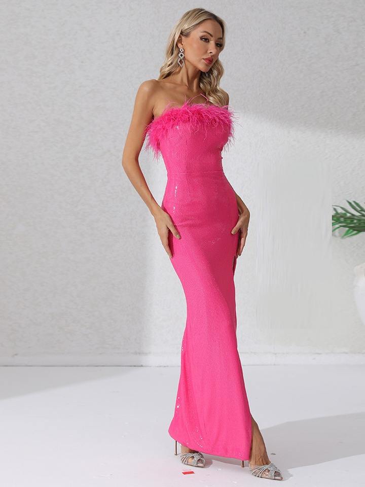 Abito Formale Aderente con Spacco al Ginocchio con Piume Traspirante Taglie S/M/L Vita Naturale Tessuto Lavabile per l'Estate