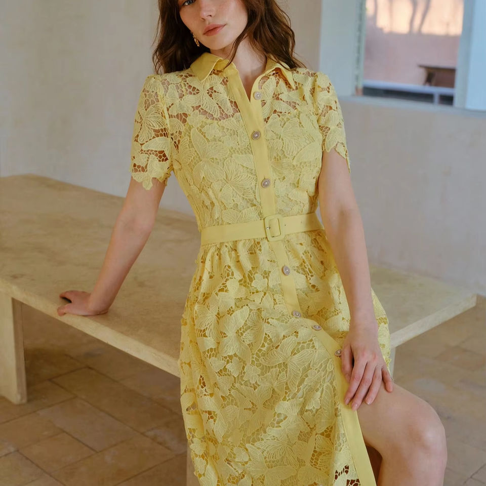 Solid Lace Dresses 2025 Summer Fashion Elegant Lapel Single-Breasted With Belt Short Sleeve Midi Dress