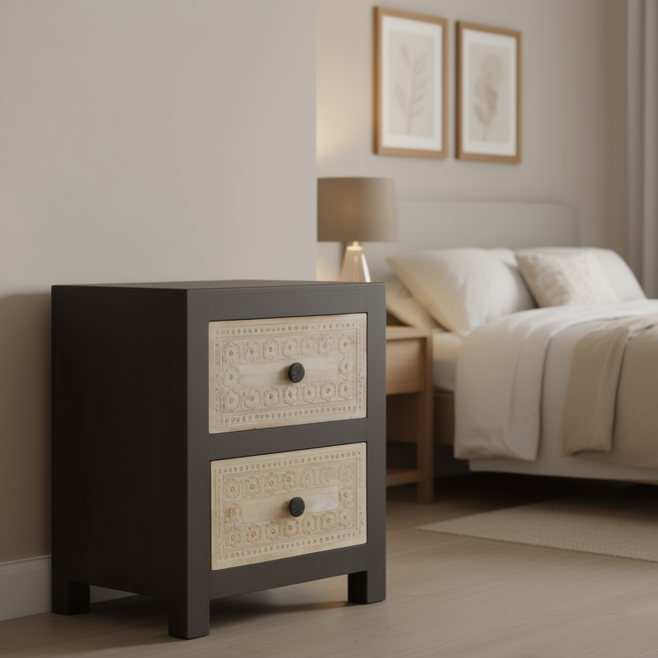 Comodino in Legno di Mango Massiccio Grigio con 2 Cassetti, Mobile Moderno Rustico per Camera da Letto, Fatto a Mano