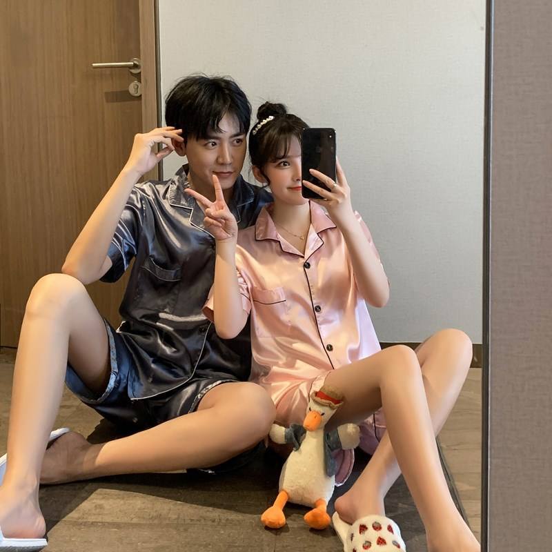 Solid Print Ice Silk Satin Women's and Men Sleepwear Short Sleeve Sets Couple's Pajamas