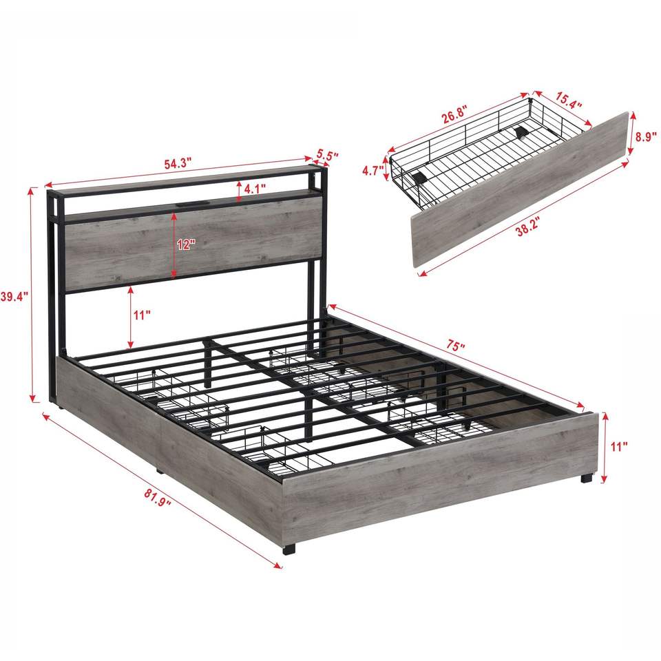Letto Matrimoniale Solido e Stabile con Stazione di Ricarica, Testiera con Vano Contenitore, Facile Montaggio, Non Richiede Rete a Doghe, Letti Imbottiti