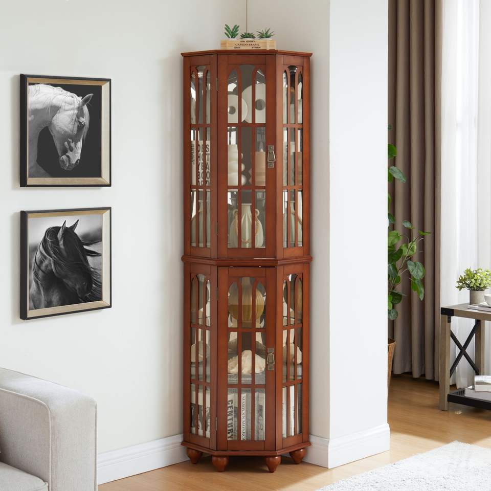 Vetrina Angolare in Legno Massello con 4 Ripiani Regolabili in Vetro Temperato, Sistema di Illuminazione e Retro in Acrilico a Specchio