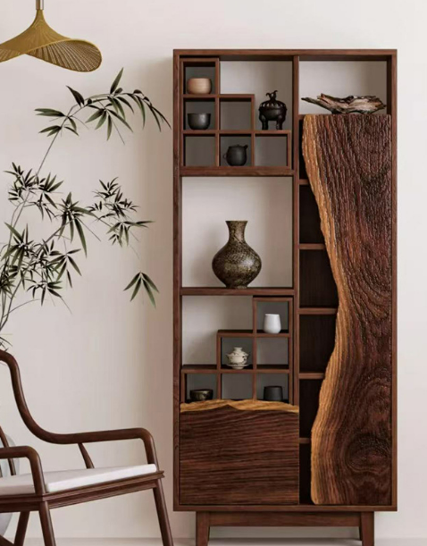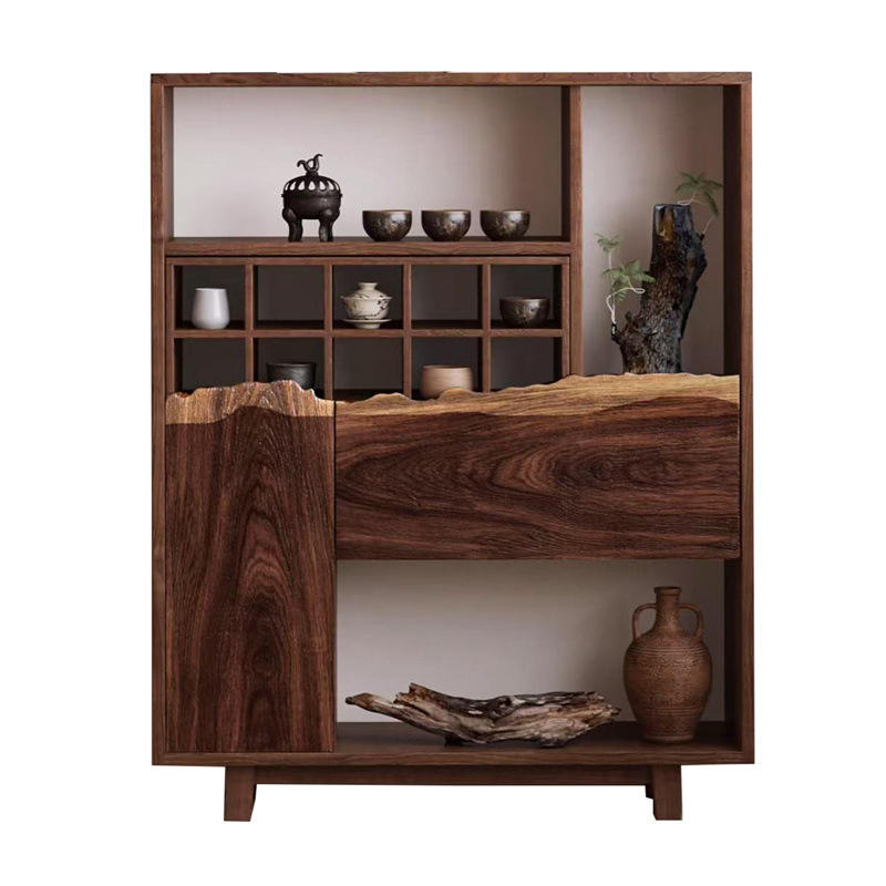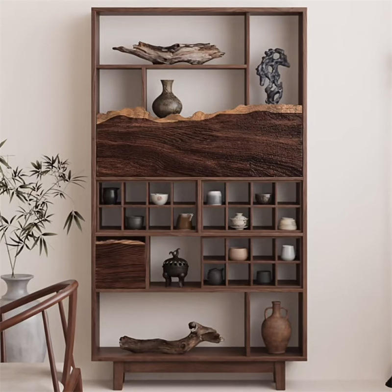 Solid Wood Curio Living Room Cabinet Tea Storage Organizer Shelf Mountain-Shaped Side Old Elm Wood for Living Room