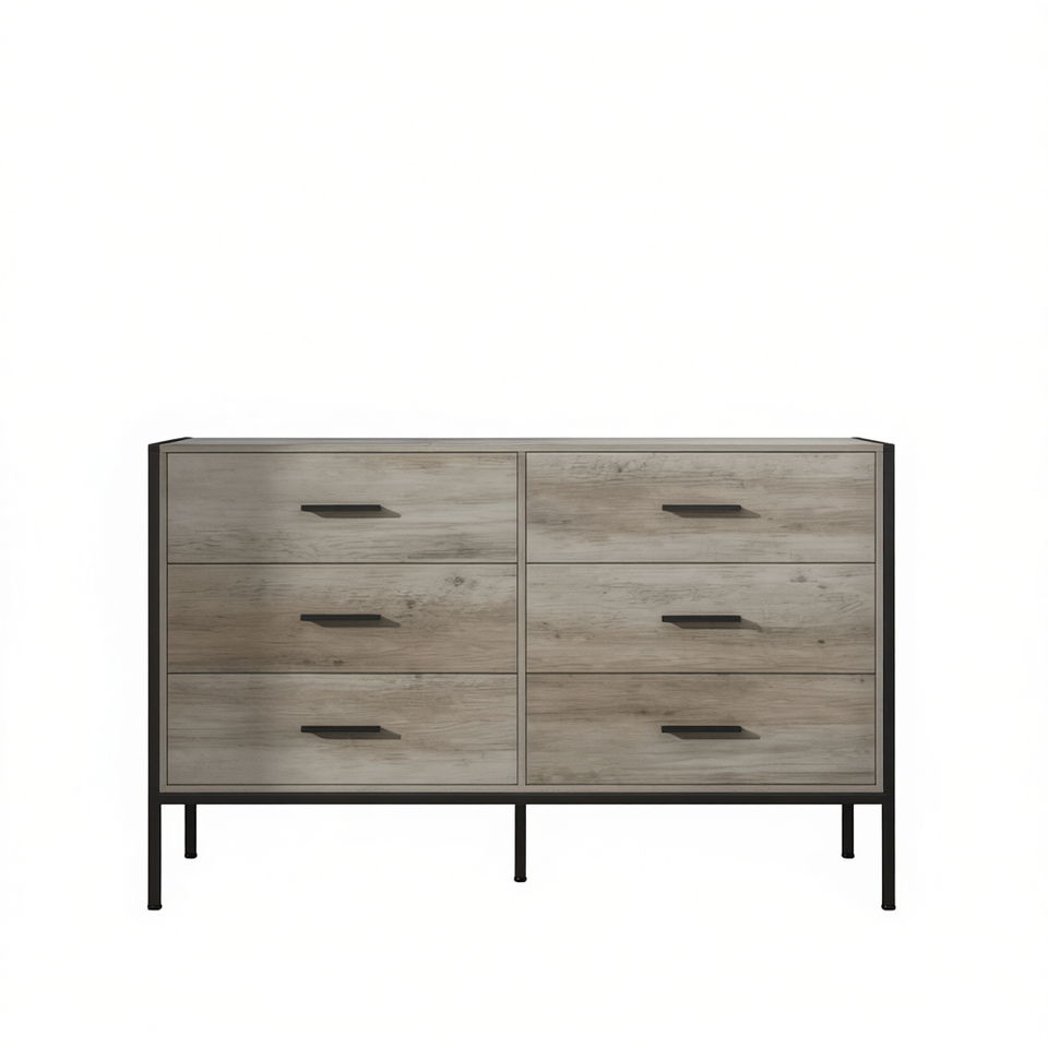 Solid Wood Dresser 6 Drawers 48 Inch Rustic Grey Steel Frame Living Room Storage Bedroom Furniture