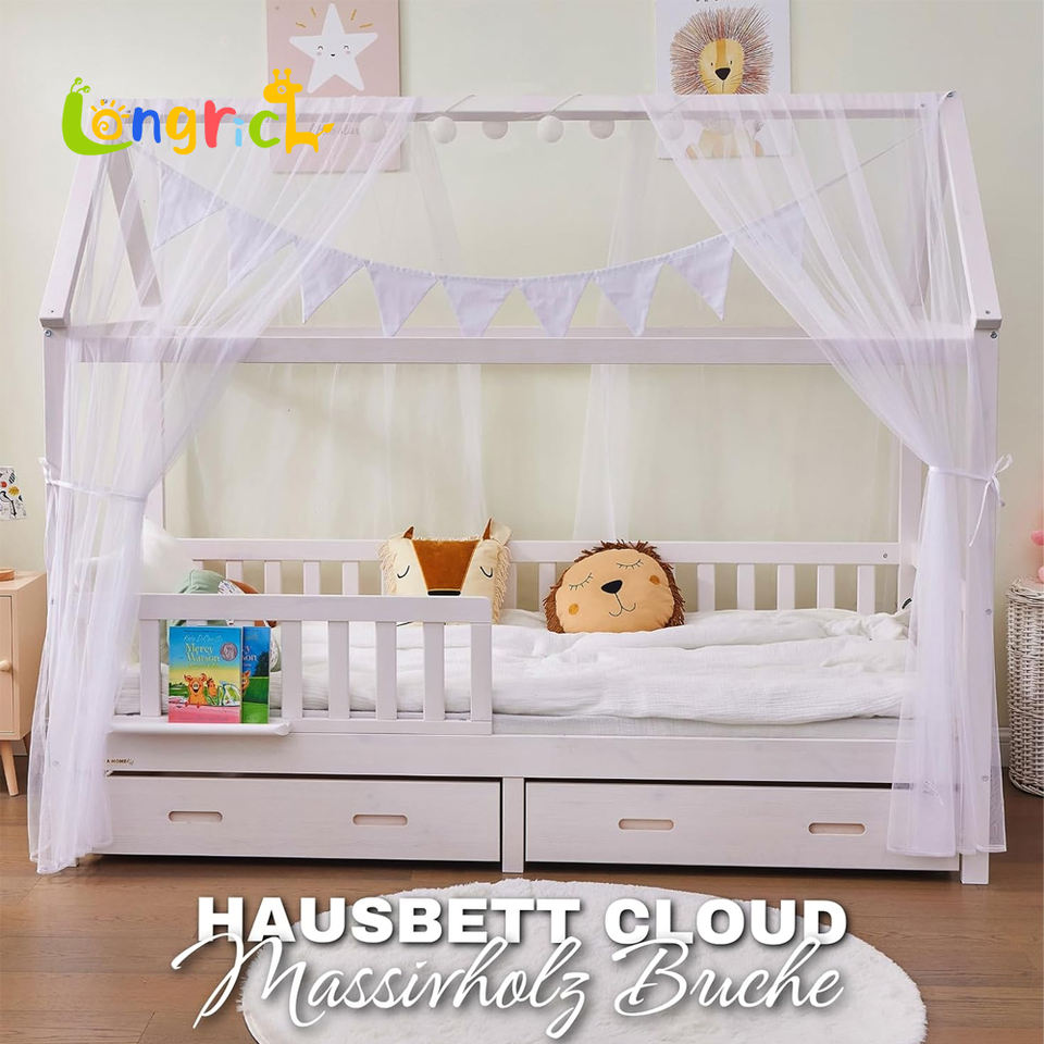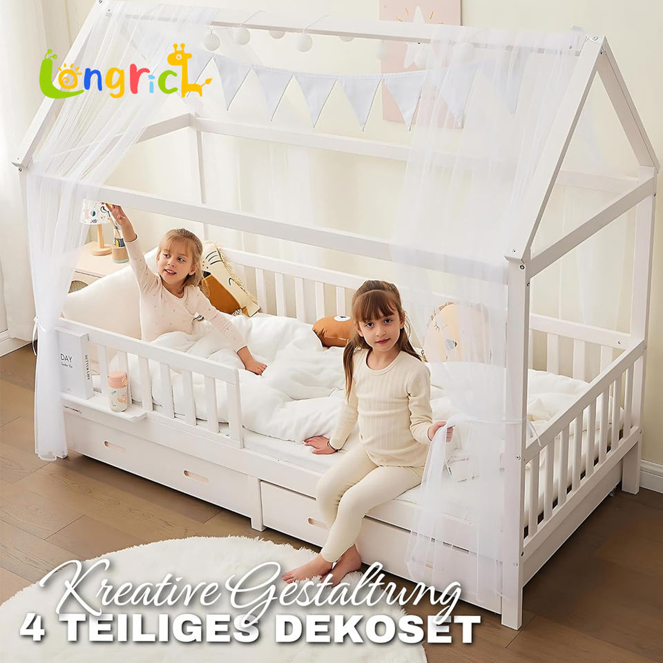 Solid Wood House Bed 90x200 cm Montessori White Floor Bed Book Tray Fall Protection Slatted Frame 4-Piece Decorative Kids